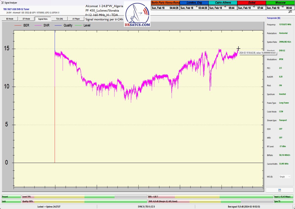 Kontinuálny signálny monitoring týmto dokazuje každodenný výskyt špičky kvality od 15 do 15,6 dB_SNR v závislosti od okamžitých poveternostných podmienok v atmosfére na frekvencii alžírskeho provajdera TDA f=12 160 MHz_H