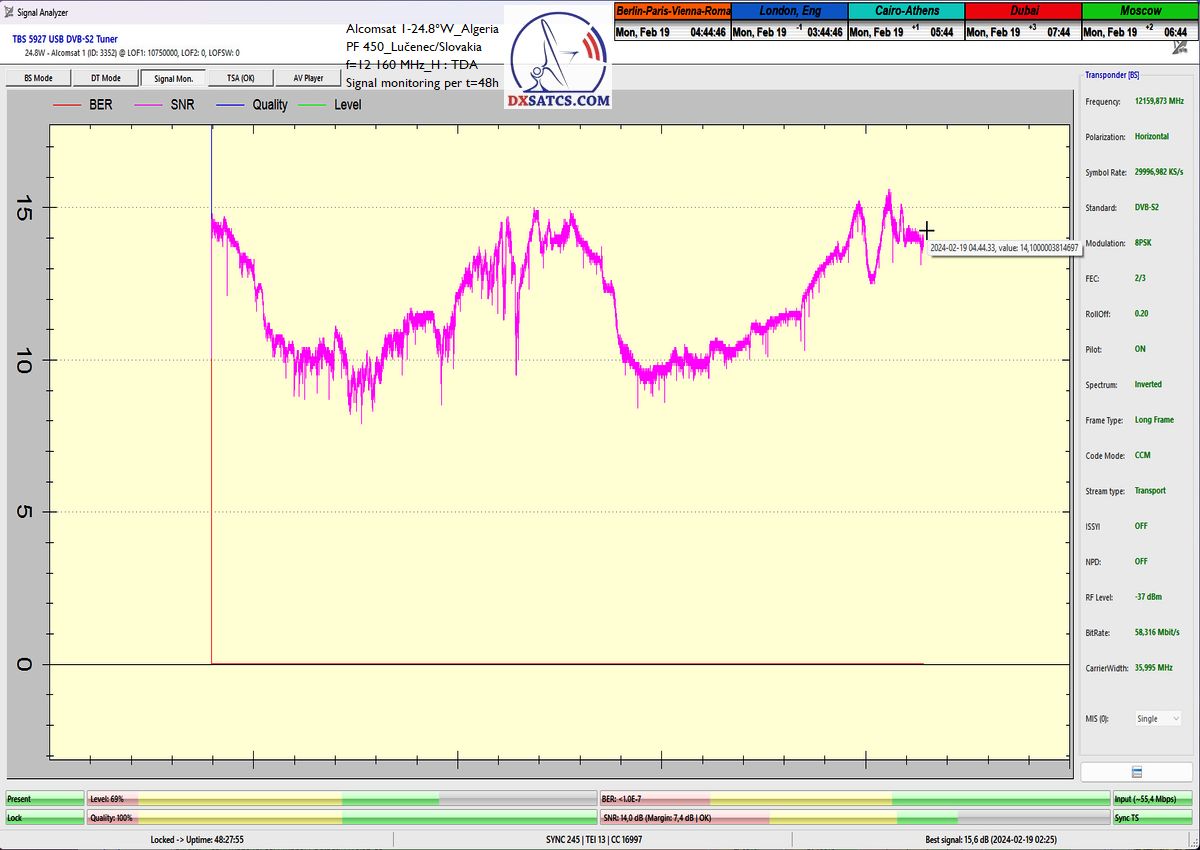 28.2.2024 : Author Roman Dávid is the first in Europe to achieve stable reception at 100% without a single dropout in the continuity of the Lock carrier with peak quality SNR=15.6 dB at the monitored frequency f=12 160 MHz in the geographical location of Central Europe and in the verification unit of t=72 hours with a reflector of a given diameter,provided by the Algerian provider TDA from the Alcomsat 1 satellite at 24.8°W.