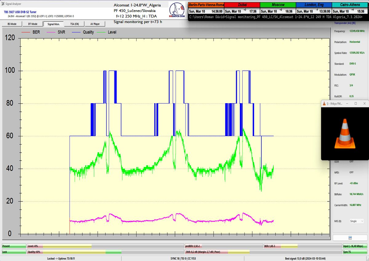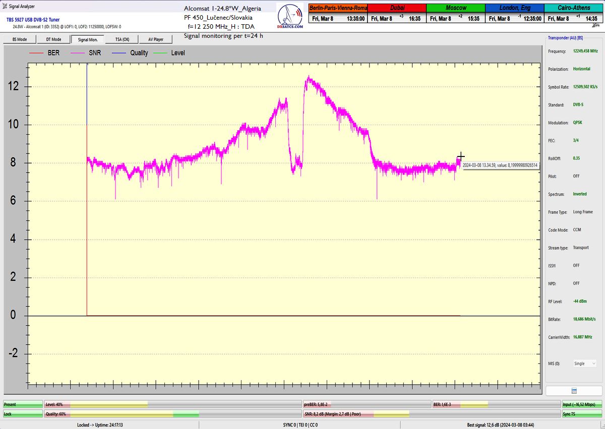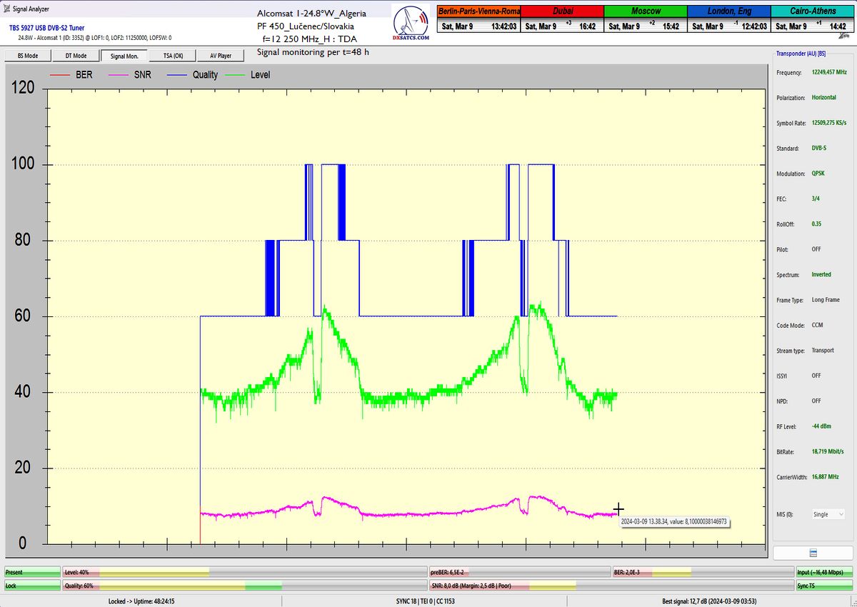 13.3.2024 :The author Roman Dávid is the first in Europe who,with a given diameter of the reflector,in a specific geographical point in Central Europe and in the verification unit of monitoring for t=72 hours,unquestionably demonstrated the achievement of a stable reception at 100% without a single outage in the continuity of the lock on the monitored frequency f=12 250 MHz of the satellite Alcomsat 1-24.8°W.