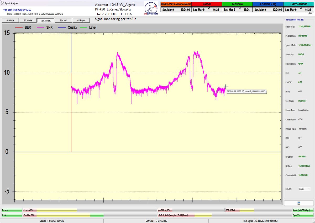 Kontinuálny signálny monitoring týmto dokazuje každodenný výskyt špičky kvality od 12,6 do 13,0 dB_SNR (TBS 5927) v závislosti od okamžitých poveternostných podmienok v atmosfére na frekvencii alžírskeho provajdera TDA f=12 250 MHz_H
