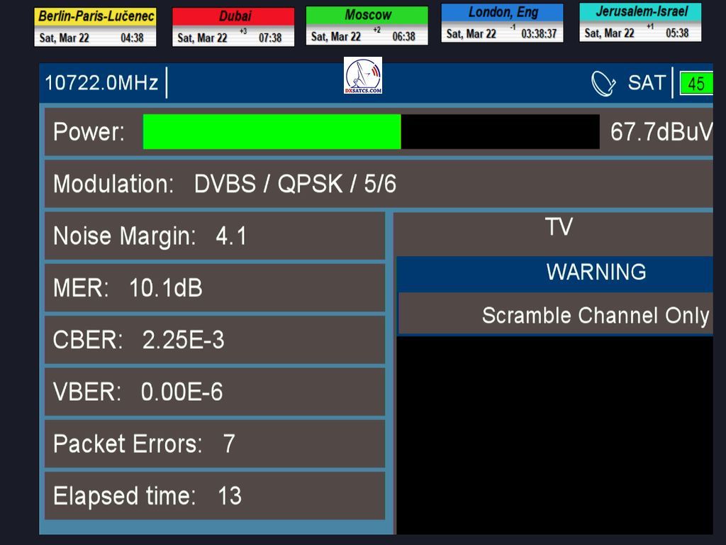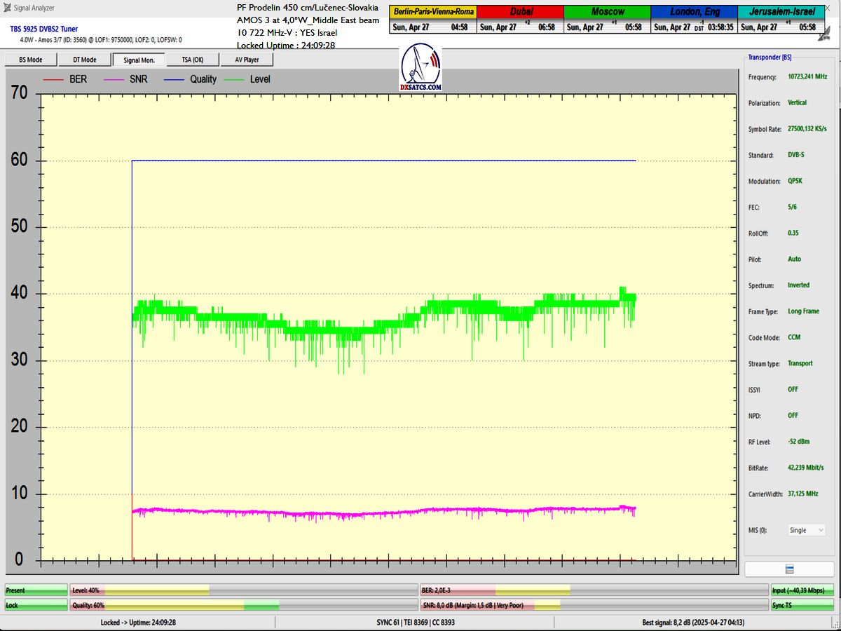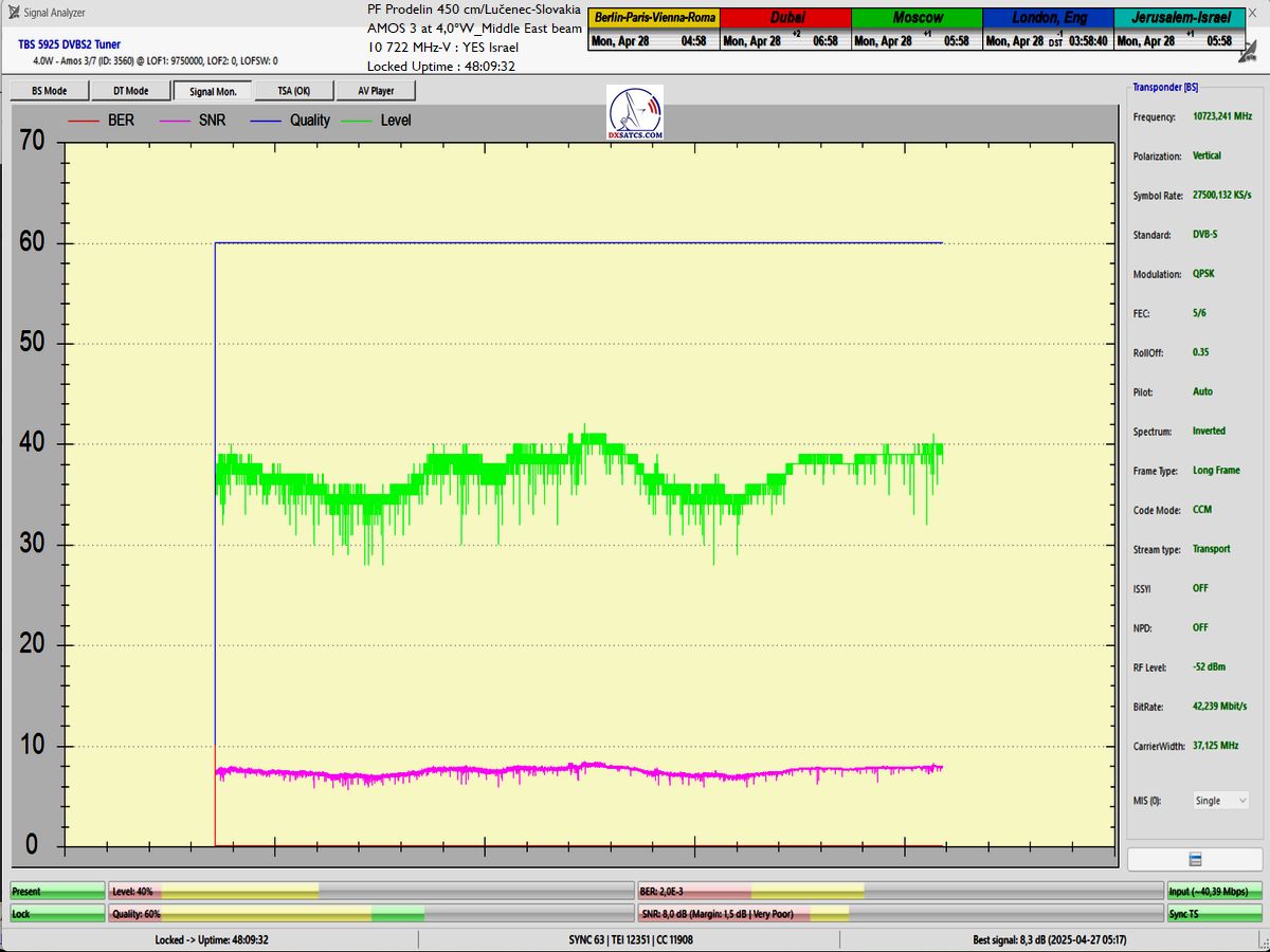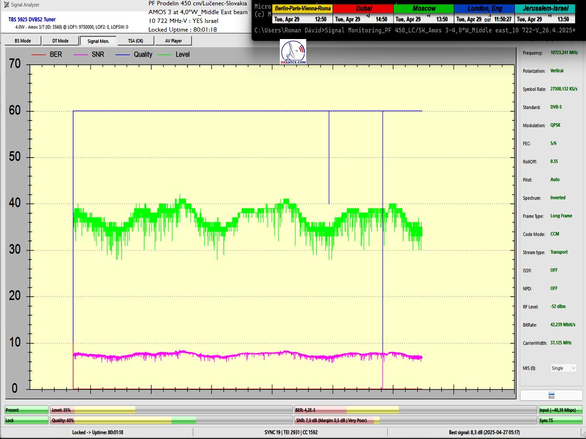 ►►Amos 3 at 4.0°W-Middle East-10 722 MHz-V_YES Israel : Analysis of signal monitoring over a duration of t=80 hours