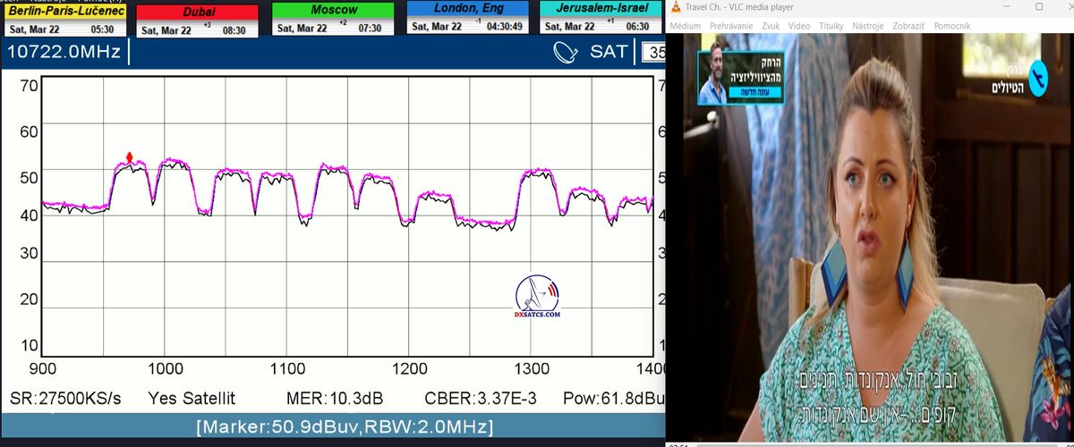 ►SK_na obrazovke môjho PC som sústredil v režime online analýzu spektra a kvality na výstupe z analyzátora Metek HD spolu s online dekódovaným streamom TV Travel Channel na SIDe=1317 v tv pakete YES Izrael vysielaného z f=10 722 MHz v systéme podmieneného prístupu NDS Videoguard
