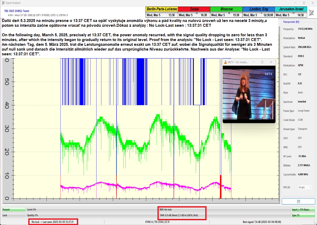 demonstrably stable satellite reception of METV at f=11,212 MHz, is a one-second pixelation or stream freeze, nothing more, and even that occurs typically under deteriorated weather conditions without a single continuity loss of the carrier lock. Subsequently, I will identify and prove the occurrence of a power anomaly, which repeated itself almost every day for eight consecutive days at the same time, from 13:35 to 13:42 CET. I am unable to influence its course and occurrence in any way, since it is related to the movement and trajectories of celestial bodies, which interfere with the trajectory of the electromagnetic wave of the Amos 3 satellite, and typically, just as it appears, it also spontaneously disappears and ceased precisely on Thursday, March 6, 2025.The course and daily occurrence of the power anomaly will then be analyzed in detail, as its appearance is clearly documented in the signal monitoring.