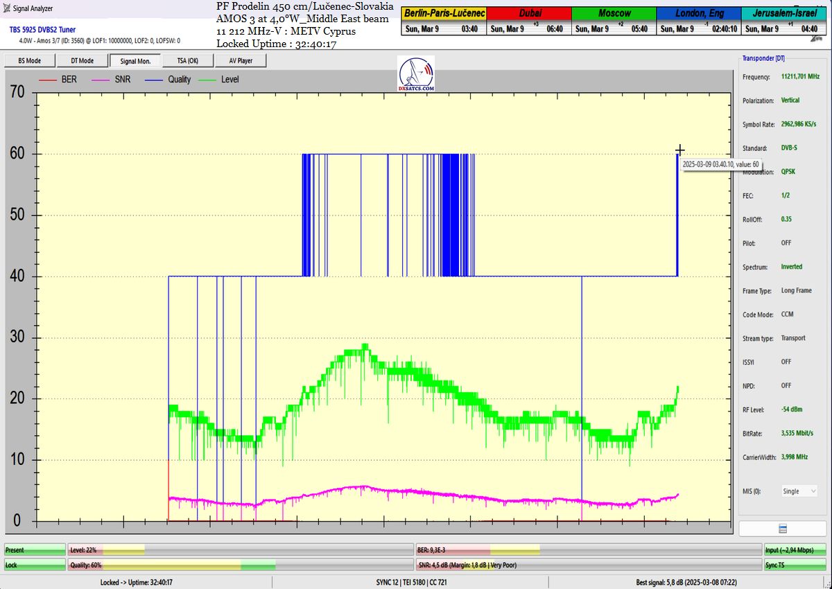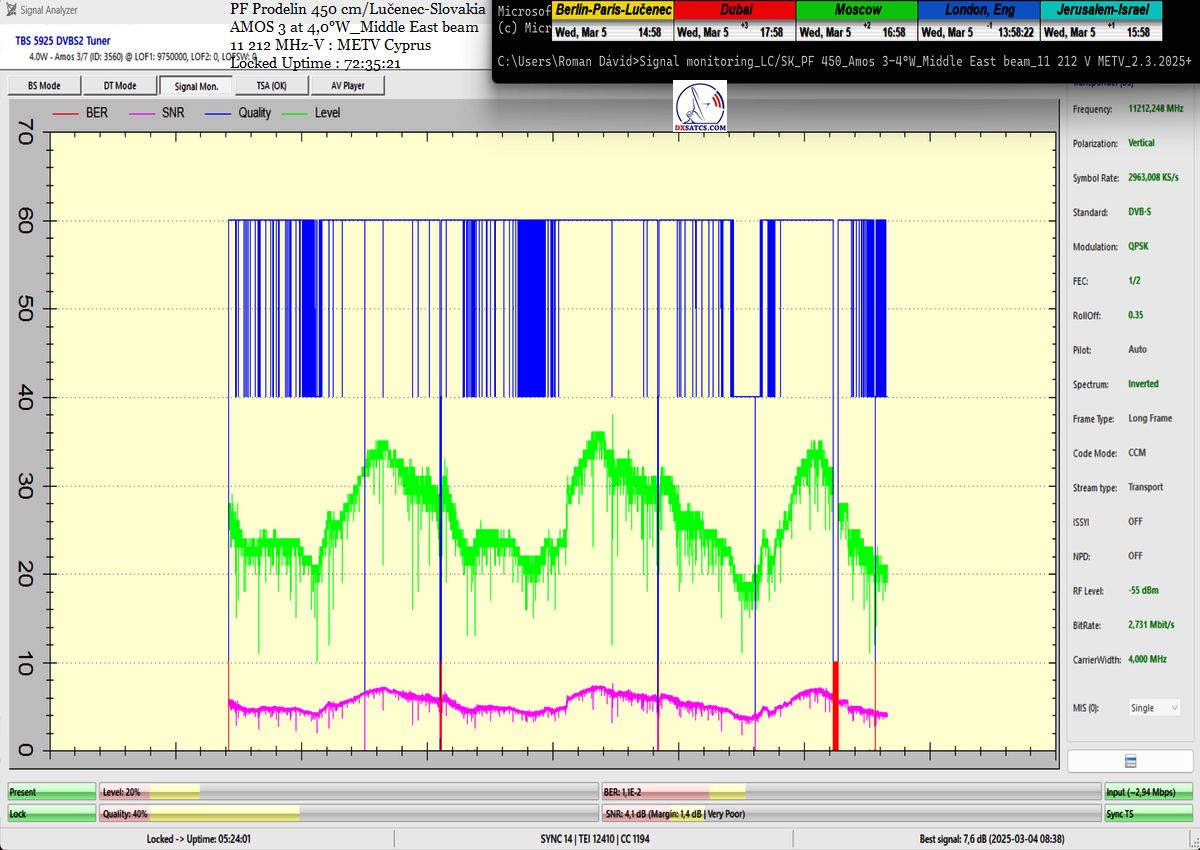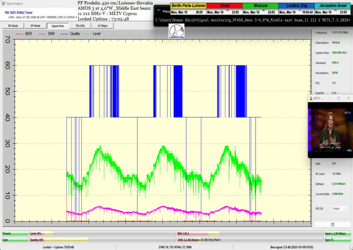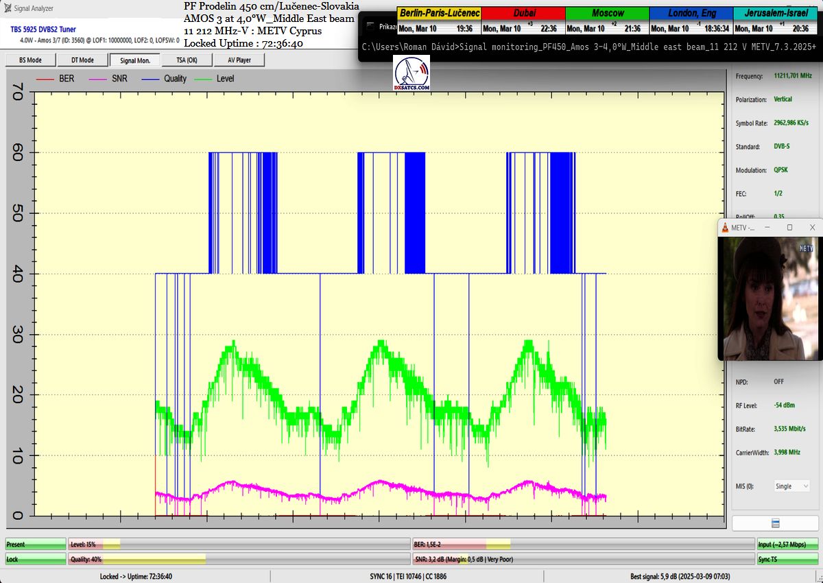 ►EN_Author Roman Dávid and his scientific-research center today publish, as the first in Europe, indisputable results of analyses concerning the achieved quality and, above all, the stability of 99.99% carrier signal reception of METV at f = 11,212 MHz_V from the satellite Amos 3. These results are verified and proven by a 72-hour signal monitoring unit using a PF 450 cm antenna for the geographic area of Central Europe, specifically regarding the possibility of satellite reception from the Middle East beam, after the parameter of Symbol Rate SR was changed to the current value of SR = 2,963 ksym/sec on March 5, 2025.