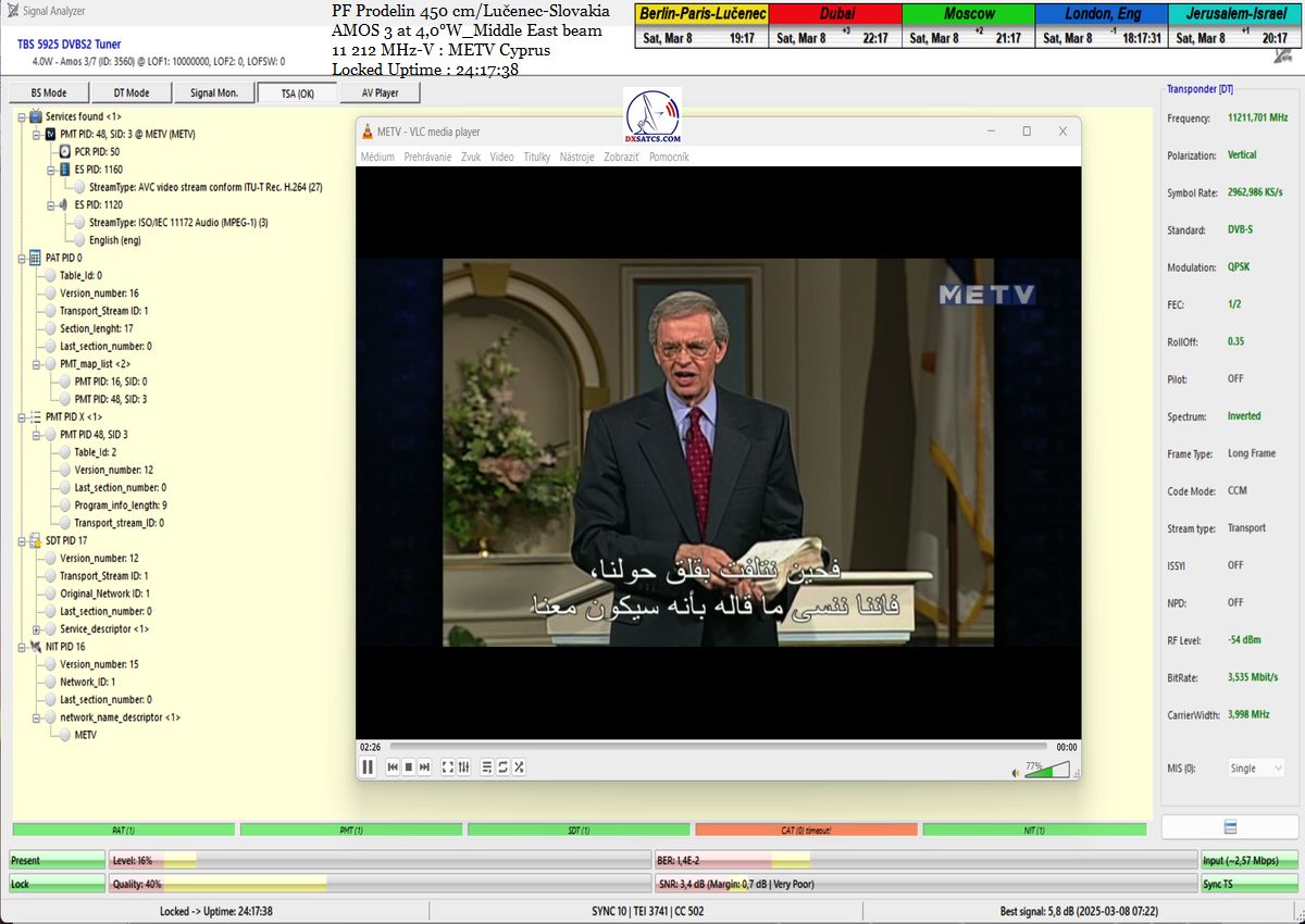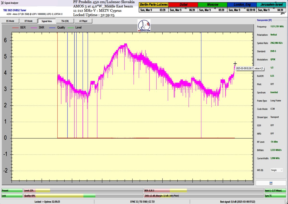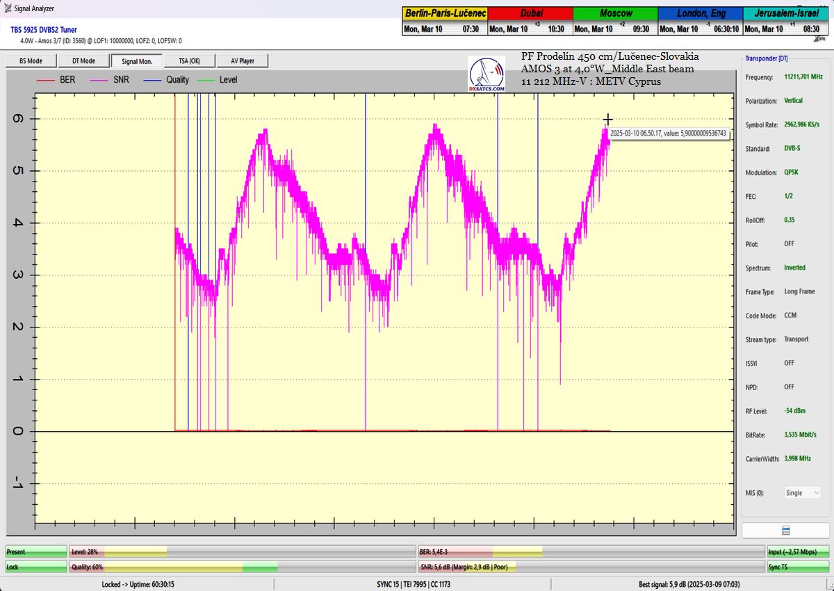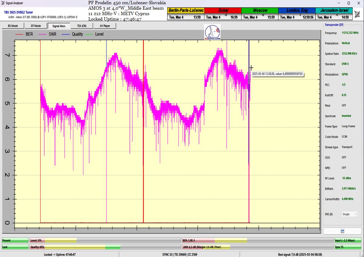 ►EN_Author Roman Dávid and his scientific-research center today publish, as the first in Europe, indisputable results of analyses concerning the achieved quality and, above all, the stability of 99.99% carrier signal reception of METV at f = 11,212 MHz_V from the satellite Amos 3. These results are verified and proven by a 72-hour signal monitoring unit using a PF 450 cm antenna for the geographic area of Central Europe, specifically regarding the possibility of satellite reception from the Middle East beam, after the parameter of Symbol Rate SR was changed to the current value of SR = 2,963 ksym/sec on March 5, 2025.