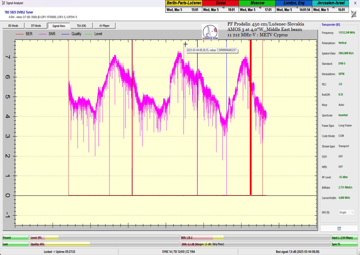 ►EN_Proof of achieving the peak quality SNR = 7.6 dB during the first signal monitoring with SR = 3,333 ksym/sec and SNR = 5.9 dB during the second monitoring with SR = 2 963 ksym/sec, along with today's peak quality at the time of preparing this update on March 18, 2025.