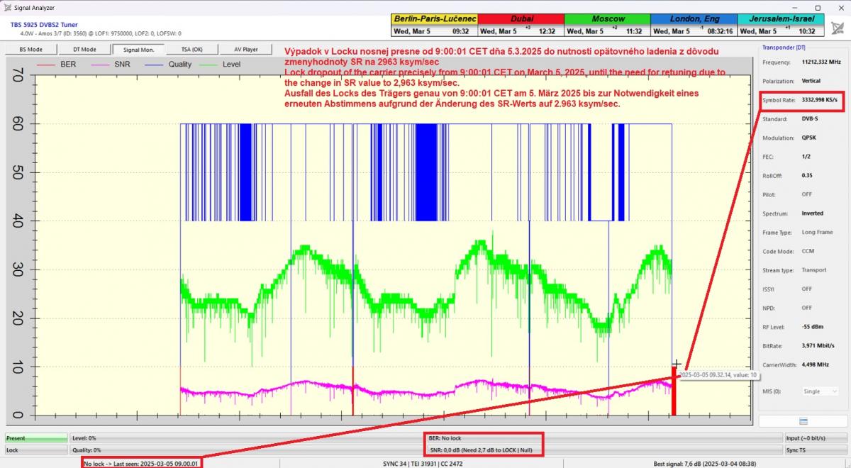 ►A-Lock dropout of the carrier precisely from 9:00:01 CET on March 5, 2025, until the need for retuning due to the change in SR value to 2,963 ksym/sec.