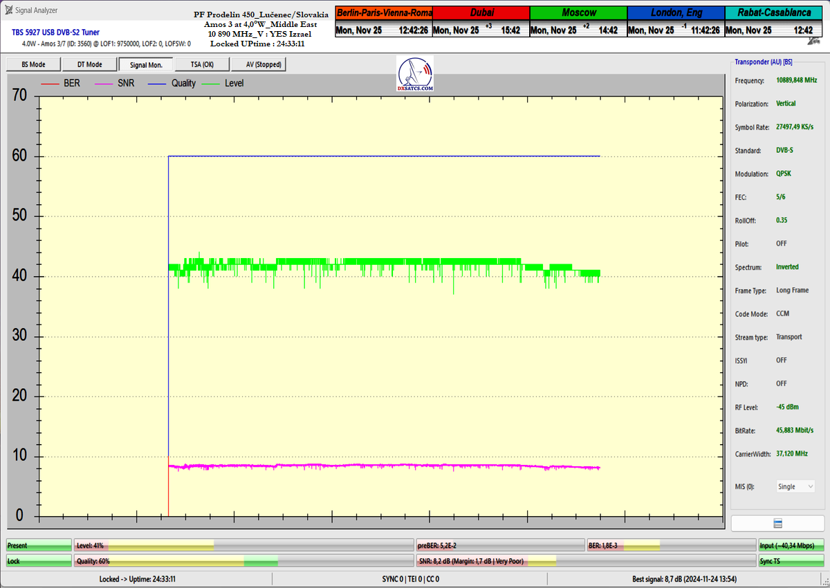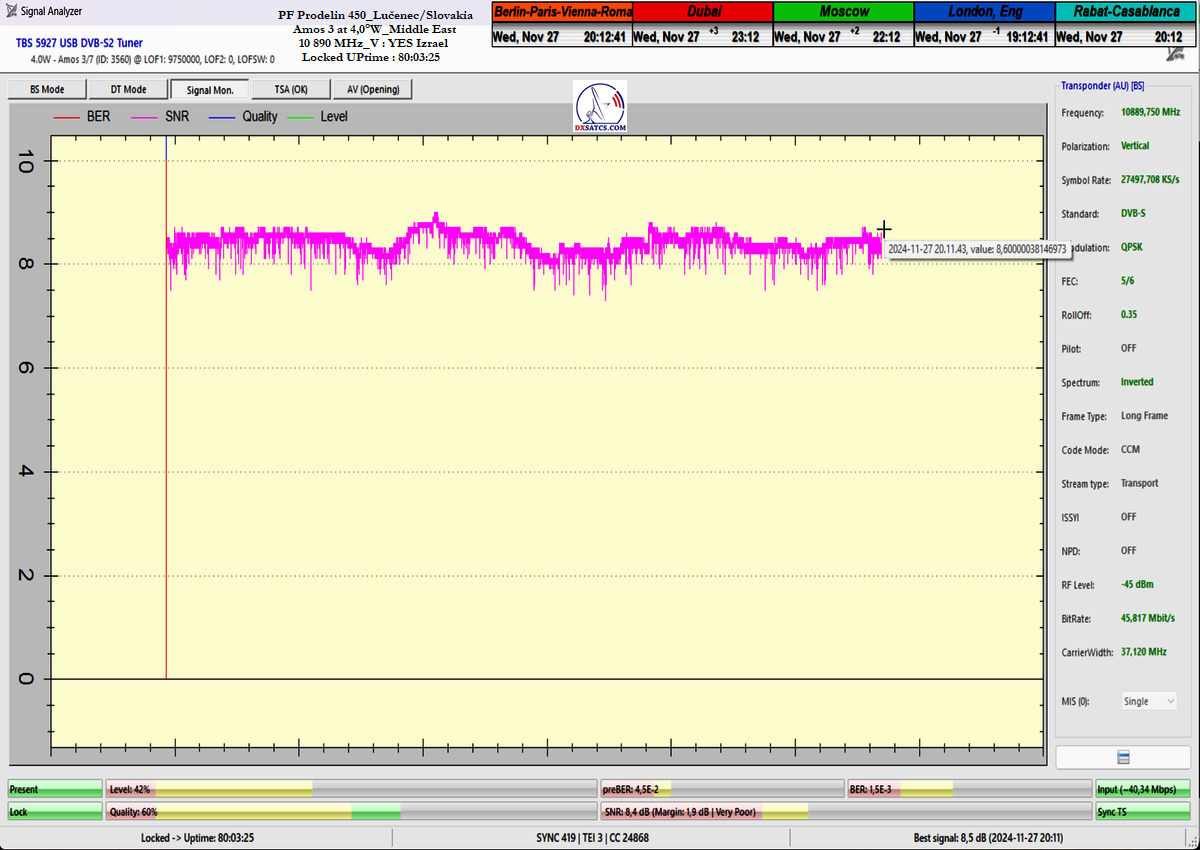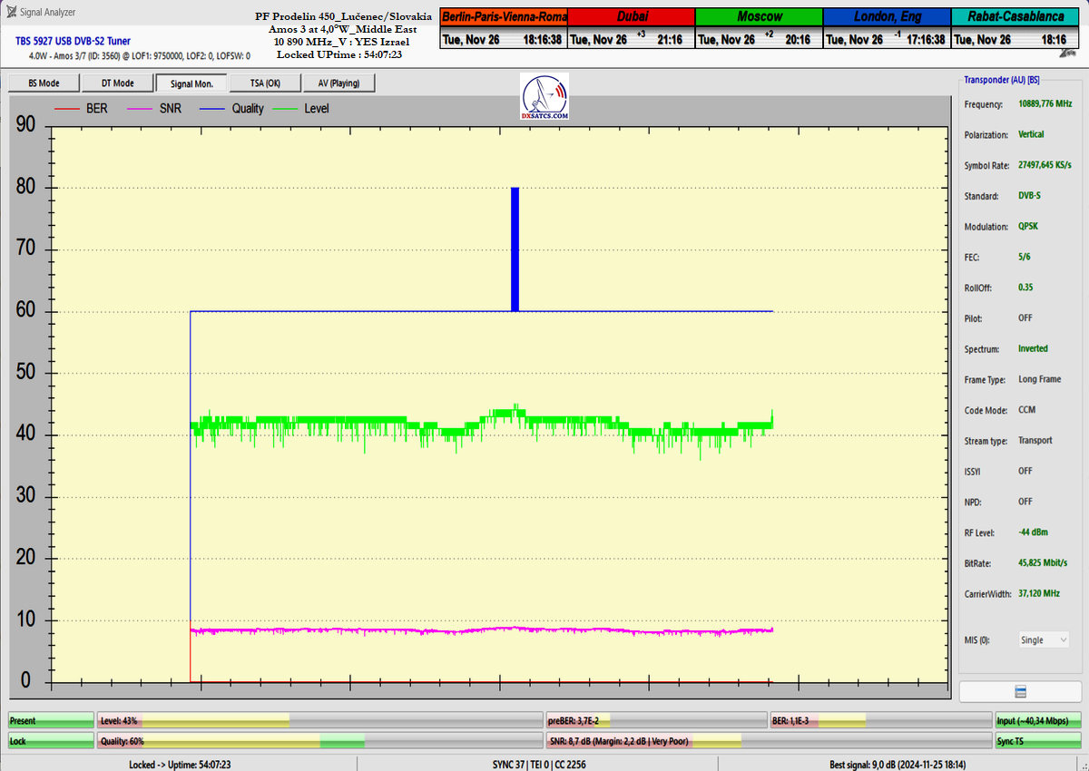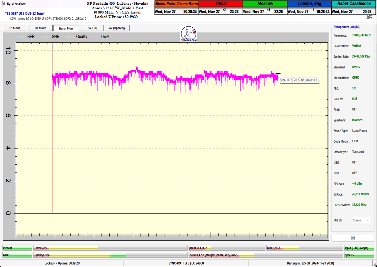 concerning the immediate signal availability of transmissions powerfully focused on the Middle East region at any second of the day. Thanks to my "Synchronous Nanocorrection" technology, there was a consistently low but stable signal margin of 1.0 to 2.5 dB/SNR during a monitoring period of t=80+ hours. Not once during this time did the signal approach the noise threshold for Lock at SNR=6.5 dB, and satellite reception remained fully stable, even under overcast skies with light rain showers.