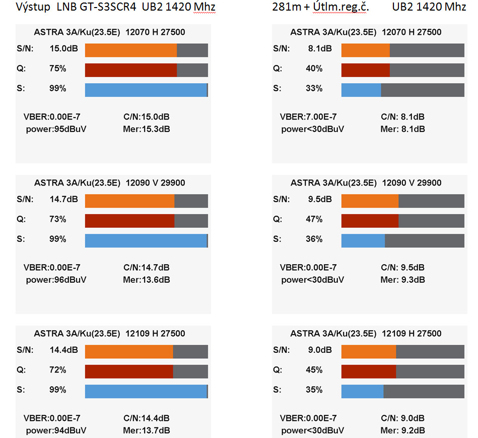 Užívateľská skupina UB2 frekvencia 1420 MHz - parametre straty výkonu na vedení sú identické ako u užívateľskej