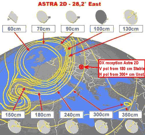 Zo skúseností s príjmom družice Astra 2D ,uvažujem len TP vo V polarizácii lebo pre prenosy vysielané v H pol.platia iné pravidlá,môžem potvrdiť že veľká časť územia západoslovenského kraja ešte nespadá so plochy POSTRANNÉHO LALOKU - SIDELOBU - pre V pol, v ktorej sa nachádza celý stred a východ Slovenska... , čo znamená že stabilný príjem ITV a BBC okruhov nie je možný s udávaným priemerom 200 cm,kvôli minimálnej signálnej kvalite,aj keď ako konkrétne popisujem vo vyššie menovanej práci jedinou objektívnou metódou na overenie dostupnosti-resp.možnosti príjmu Astry 2D je jednoducho nesmerovať RX sat.zostavu so zaručeným ziskom-ekvivalentným k danému priemeru napr.240 cm a jednoznačne definovať možnosť alebo nemožnosť identifikácie signálnej kvality V pol. prenosov BBC a ITV v analyzovanom spektre - lebo PLATÍ TU PRAVIDLO ,ktoré sa mi aj v praxi potvrdilo že s plošnými vzdialenosťami iba 10-desiatky kilometrov , môže narásť rep.poklesnúť dostupná signálna kvalita aj o 2 dB z MER napr. na TP 46 na f=10 788 MHz-PLATÍ LEN PRE TRANSPONDÉRY VYSIELANÉ VO VERTIKÁLNEJ POLARIZÁCII .