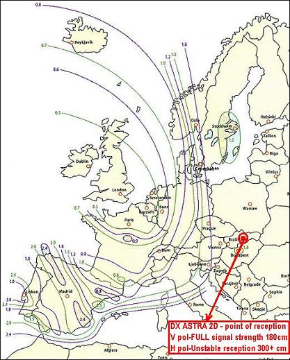 poznámka od dxsatcs.com : vo fotogalérii č.1 sú znázornené vyžarovacie diagramy - FOOTPRINT - , z ktorých na základe mojich meraní môžem s istotou potvrdiť že nedávajú objektívny pohľad z hľadiska možnosti príjmu družice Astra 2D vo východnej Európe ,nakoľko nezohľadňujú vysoké regionálne rozdiely v signálnej kvalite medzi transpondérmy vysielanými vo V - V pol ale aj v H-H pol ale aj ostatné fakty z praxe ako napr. podmienený príjem + časová viazanosť dostupnosti meratelnej signálnej kvality v H polarizácii niekoľko hodín do dňa v závislosti od použitého priemeru reflektora + polarizačná nestabilita,ktorú som zadefinoval v tejto práci ...