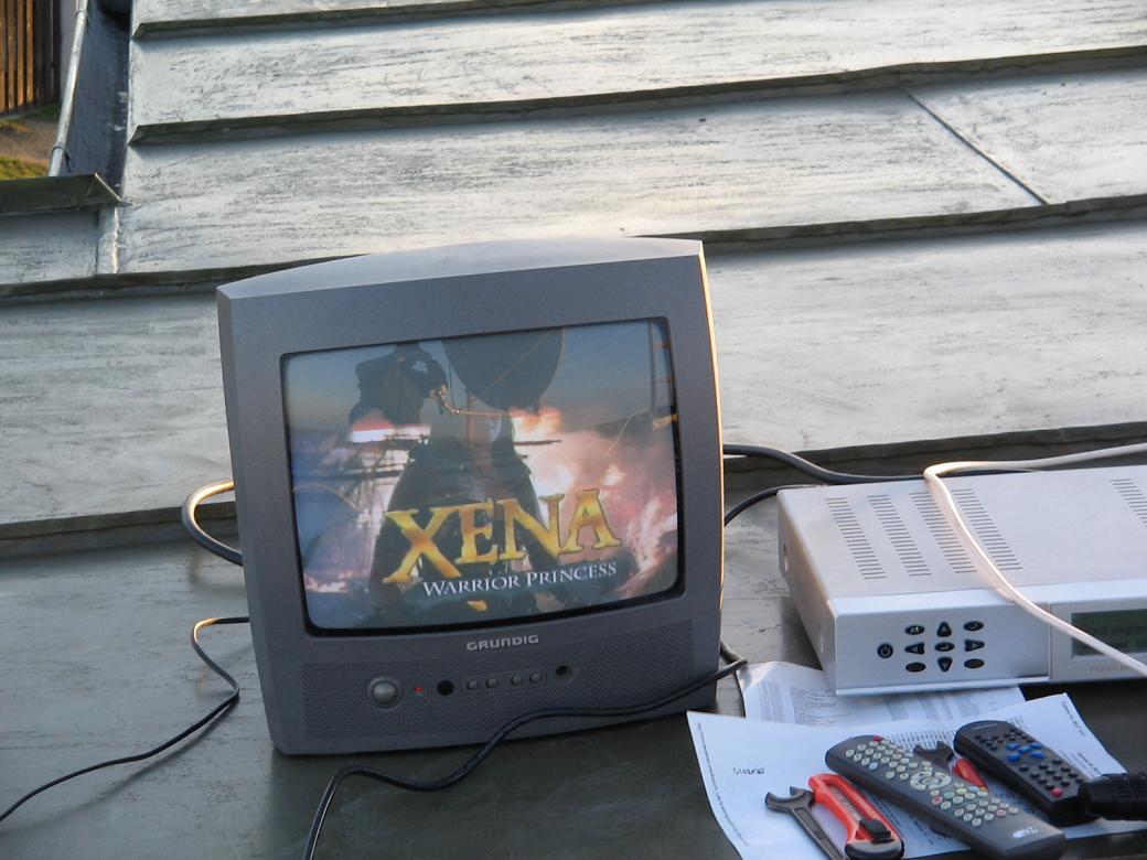 Za poměrně větrného, studeného počasí pozdě odpoledne, bez cizí pomoci najít zmíněný satelit NSS806 netrvalo snad ani  dvacet minut.  Bohužel nastupující šero mě nedovolilo zkusit vyhledat PAS9 na 58 st. západně. Vrátil jsem se k jistotě a naladil EXPRES 6A na 80 st. východně. Tady naběhly všechny programy na maximum během chvilky.  Byl jsem mile překvapen funkcí zmíněné depolarizační destičky. Tam byl asi základní problém. Na Humax 5500 bylo vyhledání satelitu velmi obtížné (neřku-li nemožné), na Tripldragona celkem bez problémů (při vložení prakticky jakékoliv frekvence z přijímaného satelitu). Když pominu nejprve černobílý obraz NTSC (výměna kabelu scart za jiný s obsazenými všemi kolíky a pohoda), pak zase výběr polarizační destičky z různého materiálu - neosvědčil se teflon, ale materiál z cuprextitové desky udělal divy. Pokud by ještě počasí dovolilo, zkusil bych možná ještě nějaký exotický satelit. Přiložené fotografie jsou dělané na rychlo, jen pro "jakous takous" dokumentaci, proto omluvte jejich kvalitu.