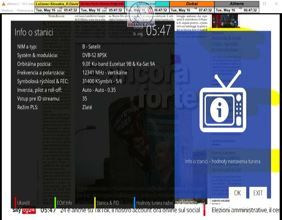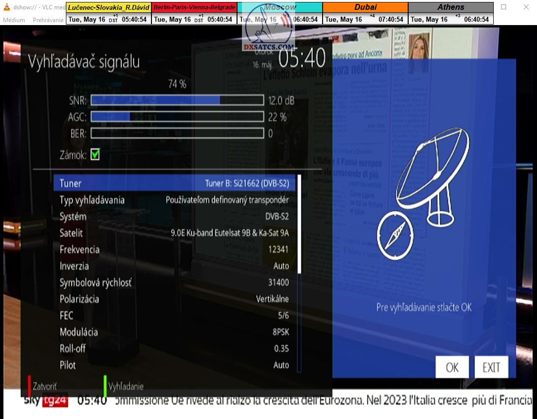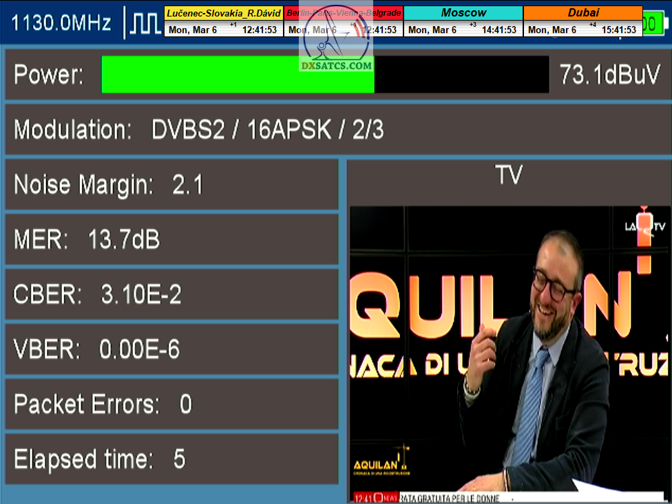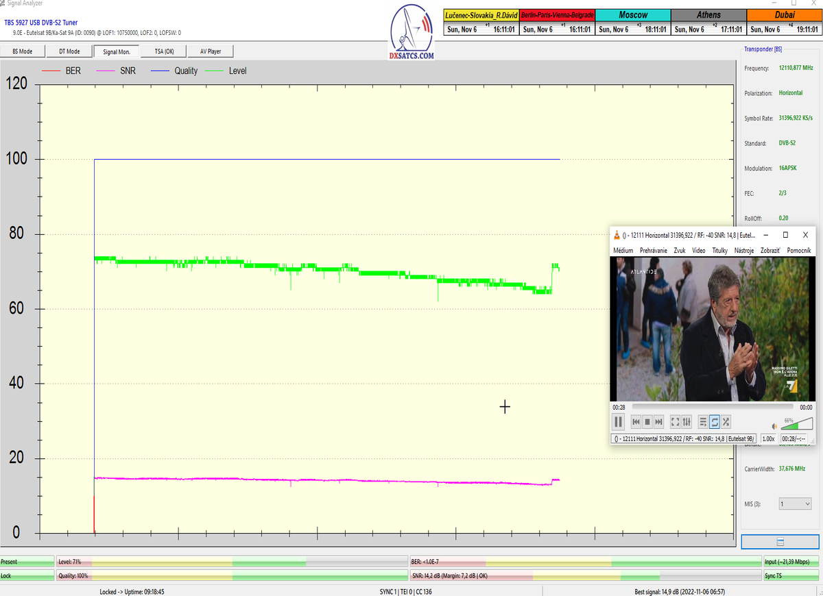 s verifikáciou stredoeurópskeho času v TV vysielaní,napríklad v SKY TG24,pretože to je dôkazom o reálnosti signálnej kvality,ktorú som v meste Lučenec dosiahol.Ak by niekto spochybňoval hladiny SNR zo samotného SW EBSpro,potom na dôkaz vyvrátenia týchto pochybností ponúkam ďalšie 3 signálne zdroje ako napríklad analyzátor Metek HD,4K receiver Octagon,SW CrazyScan a pochybnosti všetkého druhu sú razom blízke alebo rovné NULE. Ospravedlňujem sa za môj slovník určený pre publikum s určitou mierou "mentálnej invalidity alebo mentálneho postihnutia",ale občas je vhodné zopakovať si aj elementárnu abecedu,pretože nie každý čitateľ pochádza z odbornej alebo vedeckej sféry a moje vysvetlenie smerujem aj do radov takzvaných