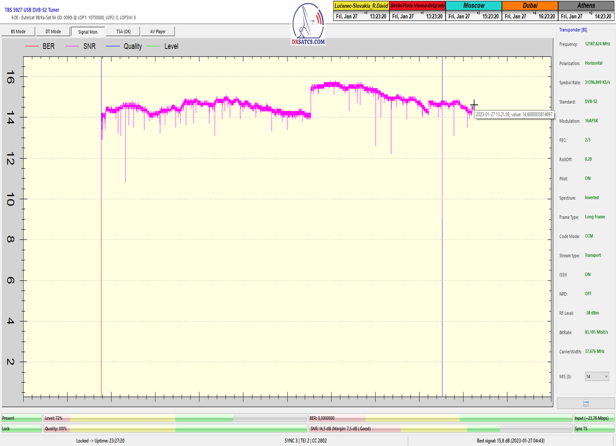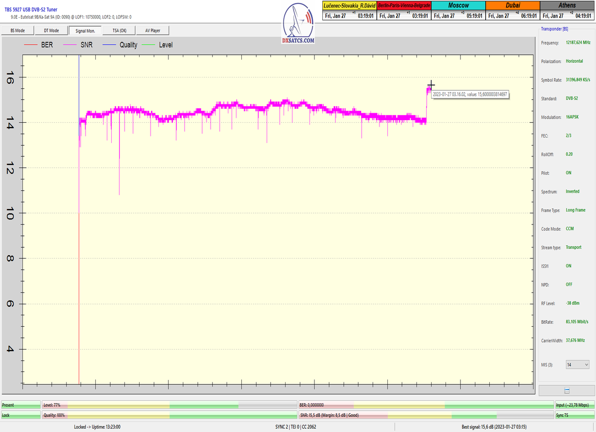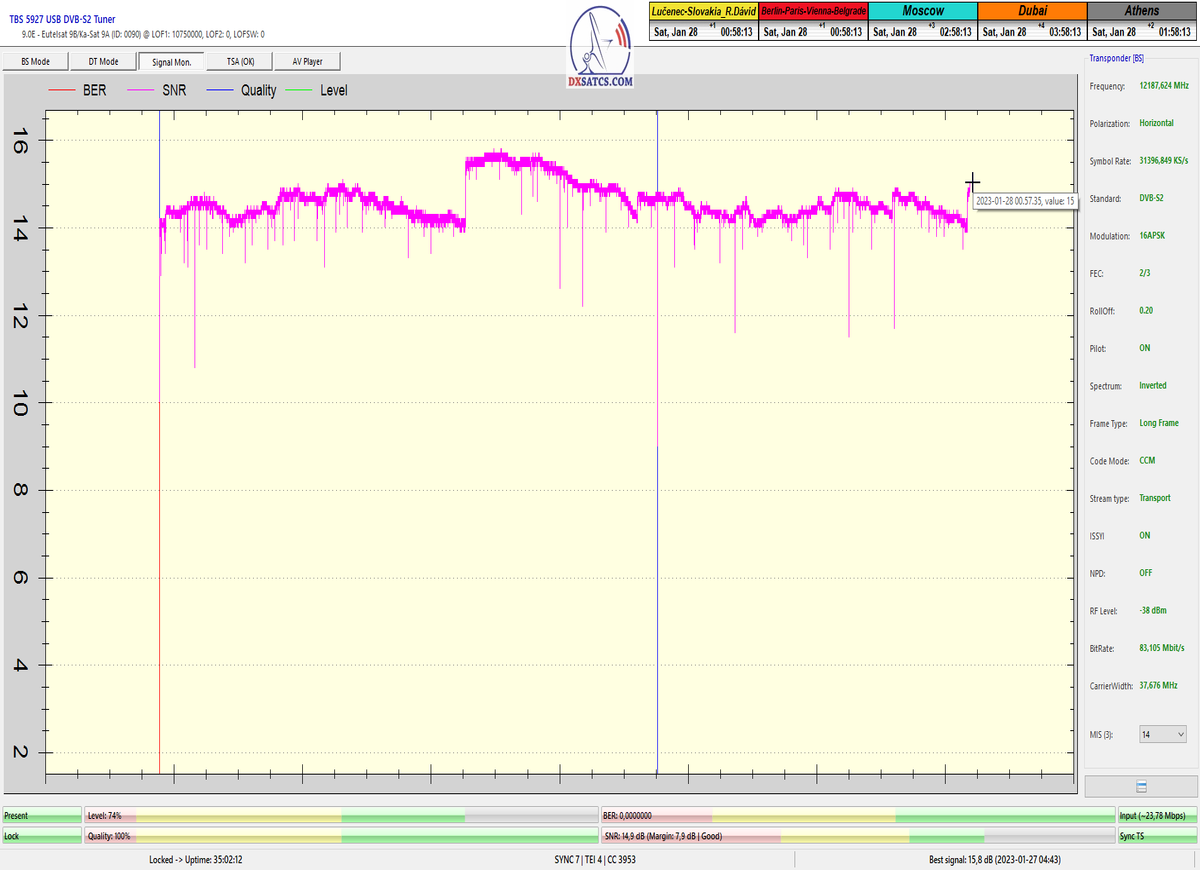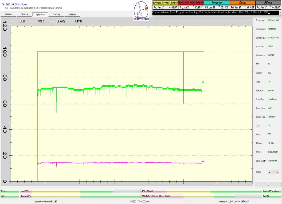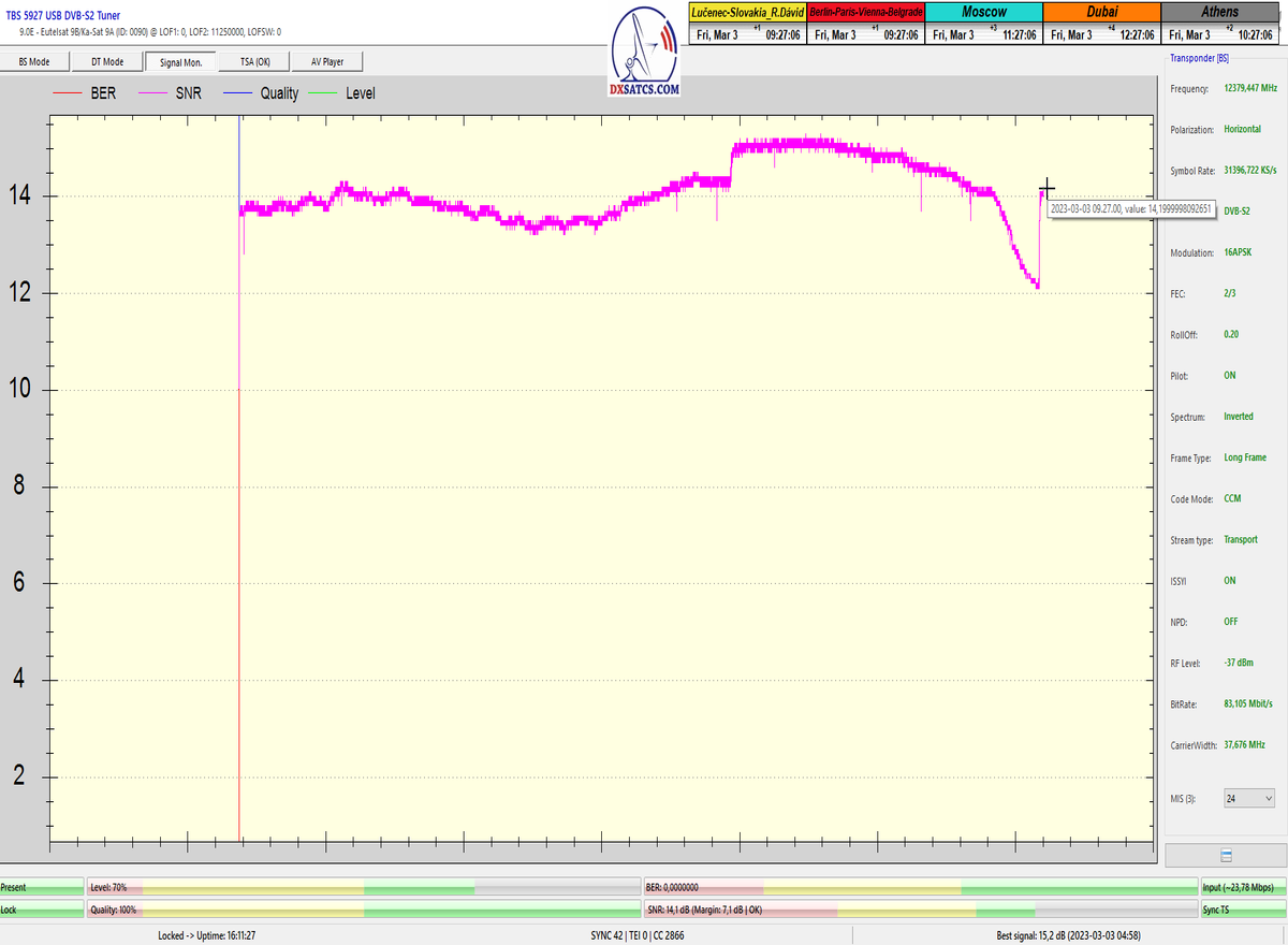 ►8.2.2023 : Na príklade dokazovania v signálnom monitoringu v dĺžke 1x73 hodín dnes nespochybniteľne dokážem začlenenie frekvencie f=12 188 MHz_V do DTH kategorizácie štandardnej formy konštantne stabilného satelitného príjmu (99,999%) s doteraz najvyššou špičkou kvality okolo SNR=15,8 dB ktorá sa opakuje každý deň.Z technologickej stránky je príjem z TP IT3 výnimočný hlavne tým že veľkosť uhlovej odchýlky SKEW ostáva konštantná aj pri výrazných zmenách v poveternostných podmienkach.Ďalej dnes dokážem plnú stabilitu príjmu v štandarde DVBS2-16APSK-Multistream aj pri intenzívnom snežení dňa 27.1.2023 so stabilnou výškou kvality okolo SNR=14,3 dB atď