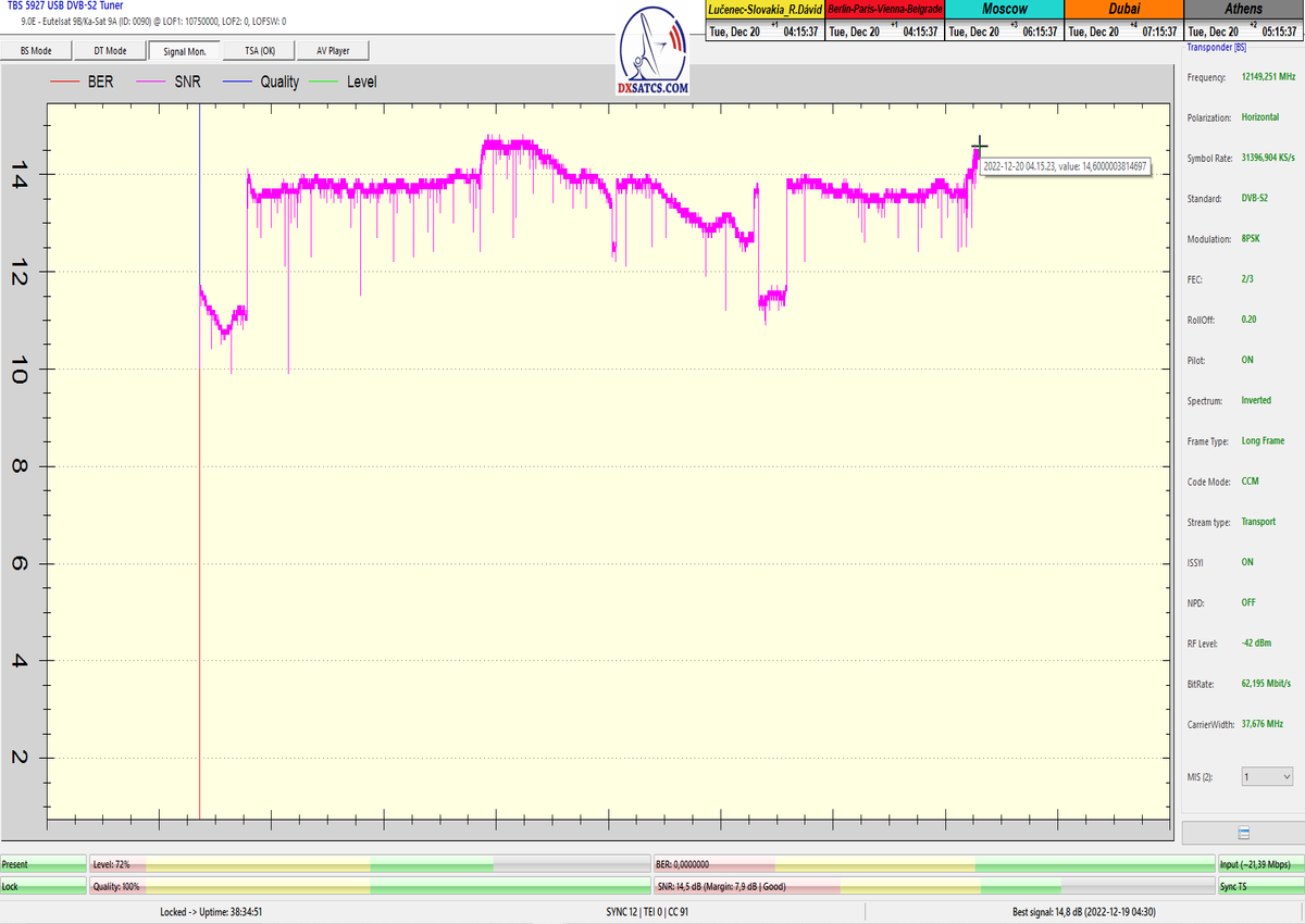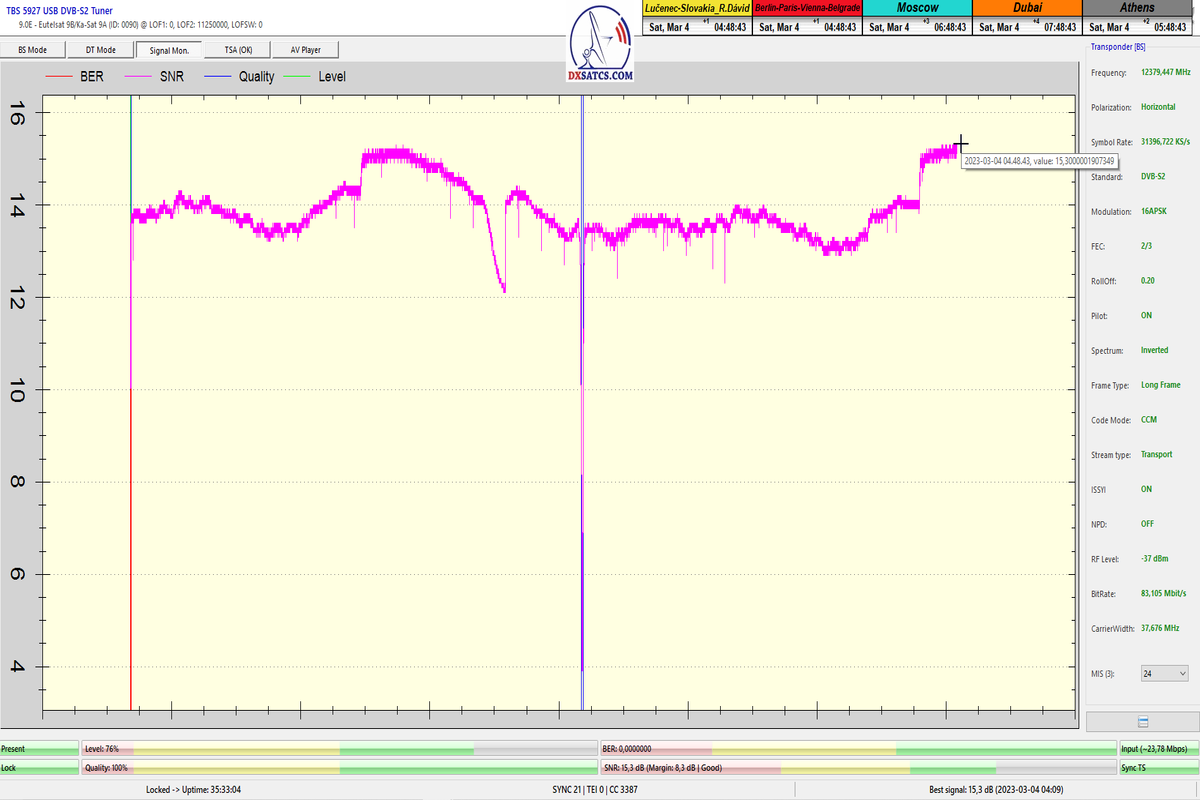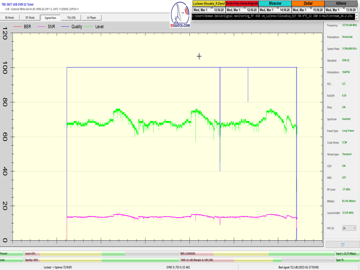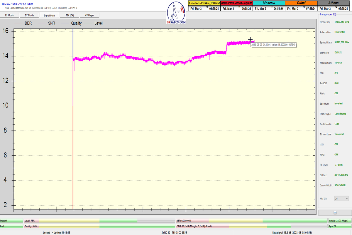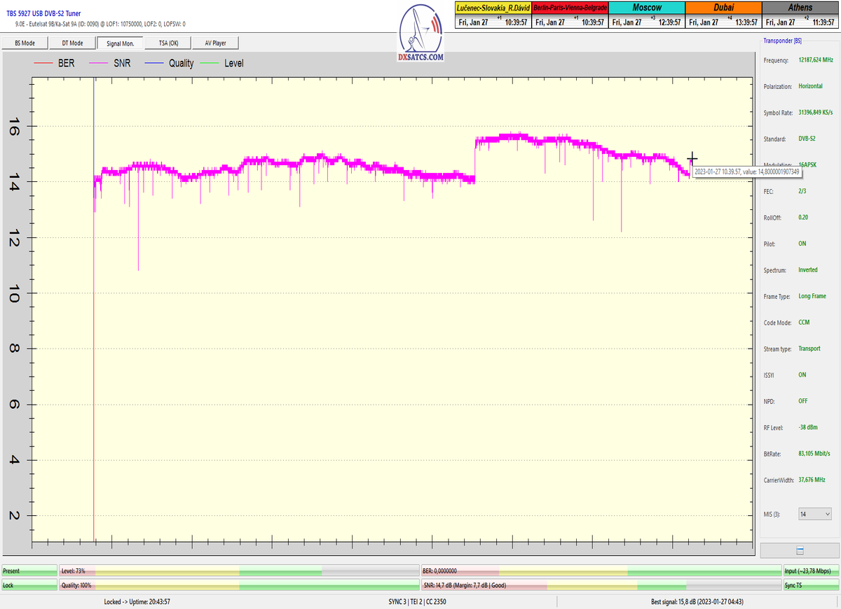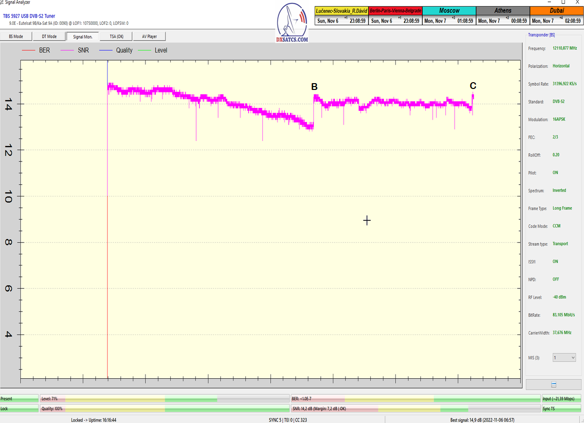 ►8.2.2023 : Na príklade dokazovania v signálnom monitoringu v dĺžke 1x73 hodín dnes nespochybniteľne dokážem začlenenie frekvencie f=12 188 MHz_V do DTH kategorizácie štandardnej formy konštantne stabilného satelitného príjmu (99,999%) s doteraz najvyššou špičkou kvality okolo SNR=15,8 dB ktorá sa opakuje každý deň.Z technologickej stránky je príjem z TP IT3 výnimočný hlavne tým že veľkosť uhlovej odchýlky SKEW ostáva konštantná aj pri výrazných zmenách v poveternostných podmienkach.Ďalej dnes dokážem plnú stabilitu príjmu v štandarde DVBS2-16APSK-Multistream aj pri intenzívnom snežení dňa 27.1.2023 so stabilnou výškou kvality okolo SNR=14,3 dB atď