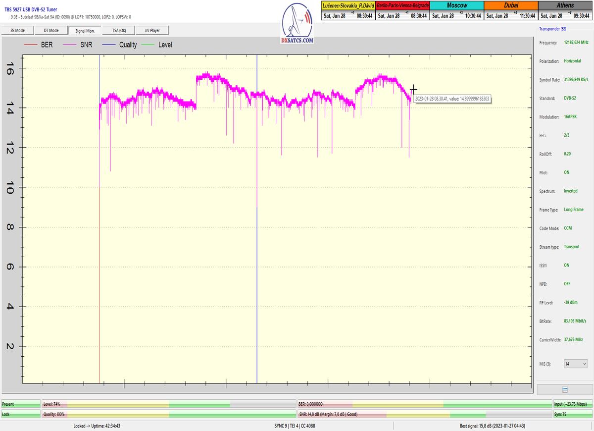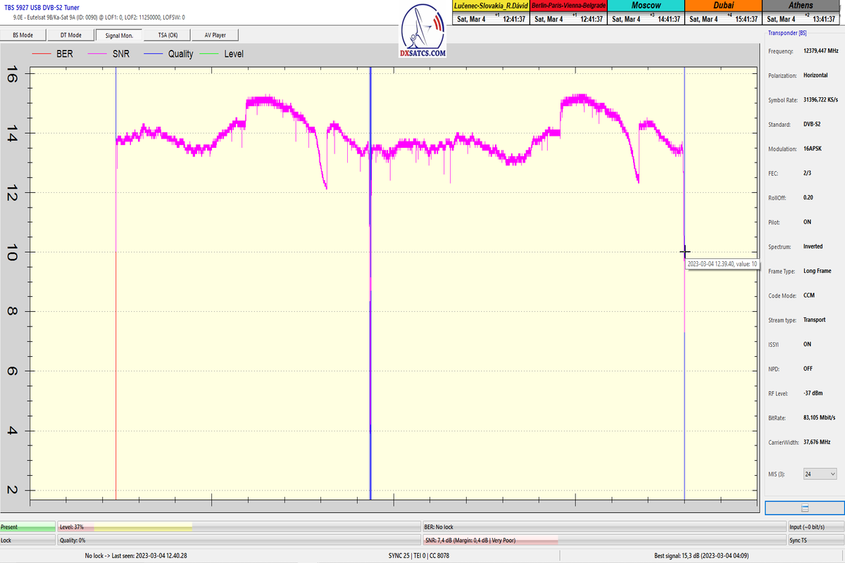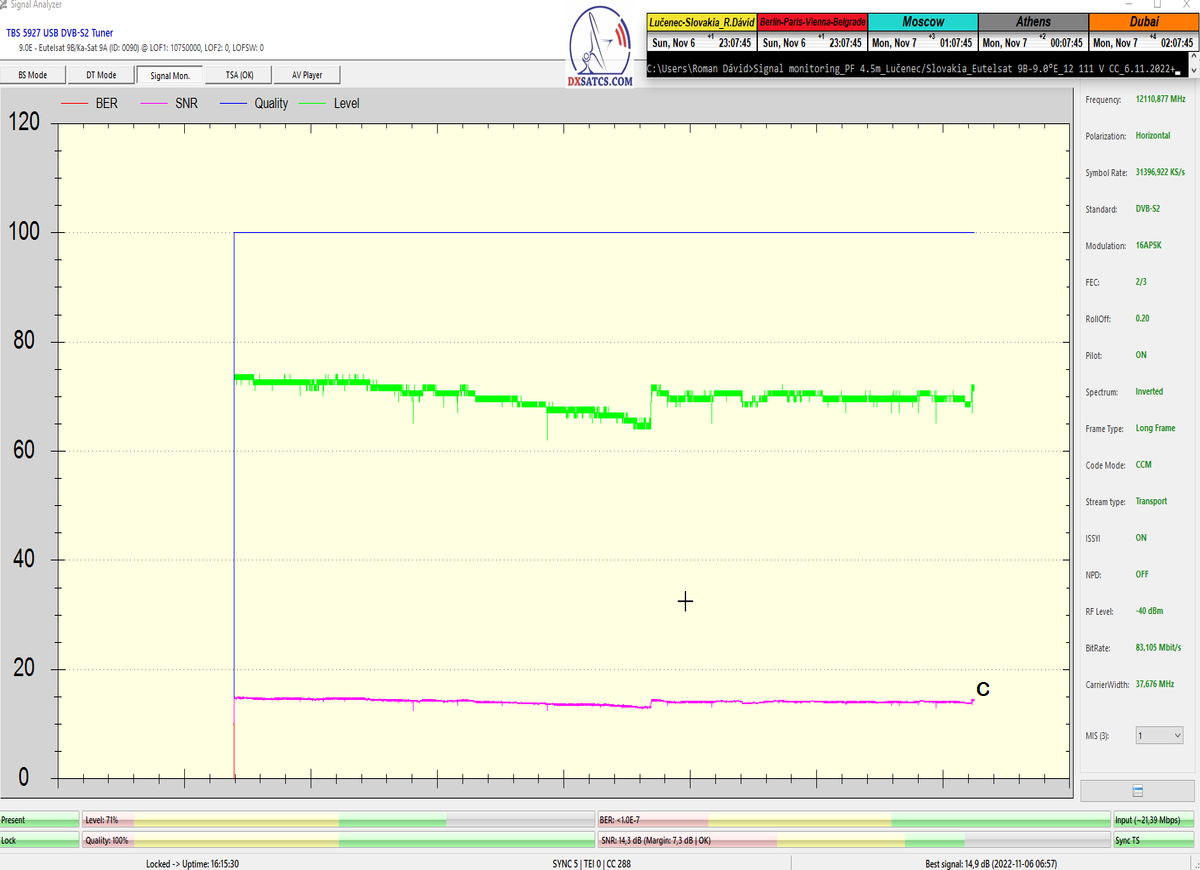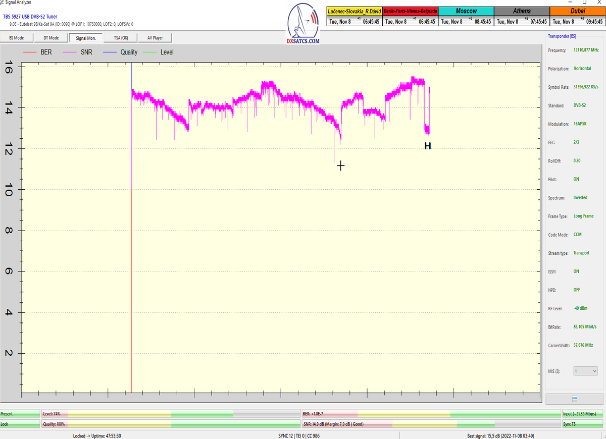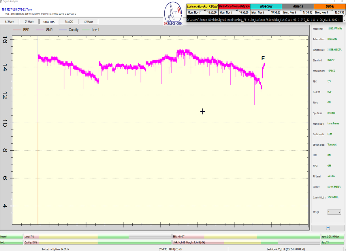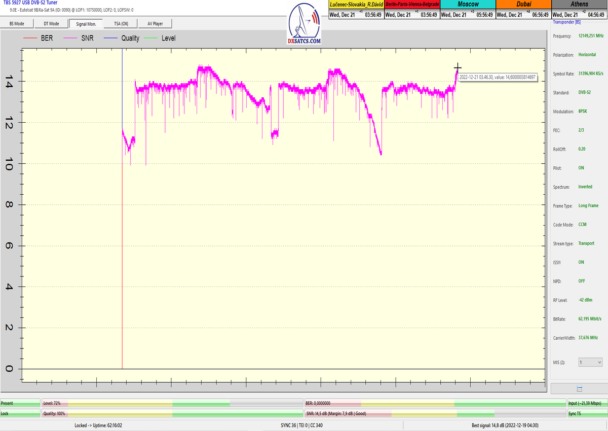►8.2.2023 : Na príklade dokazovania v signálnom monitoringu v dĺžke 1x73 hodín dnes nespochybniteľne dokážem začlenenie frekvencie f=12 188 MHz_V do DTH kategorizácie štandardnej formy konštantne stabilného satelitného príjmu (99,999%) s doteraz najvyššou špičkou kvality okolo SNR=15,8 dB ktorá sa opakuje každý deň.Z technologickej stránky je príjem z TP IT3 výnimočný hlavne tým že veľkosť uhlovej odchýlky SKEW ostáva konštantná aj pri výrazných zmenách v poveternostných podmienkach.Ďalej dnes dokážem plnú stabilitu príjmu v štandarde DVBS2-16APSK-Multistream aj pri intenzívnom snežení dňa 27.1.2023 so stabilnou výškou kvality okolo SNR=14,3 dB atď