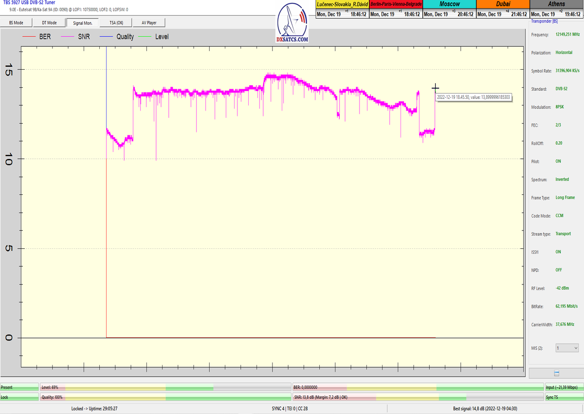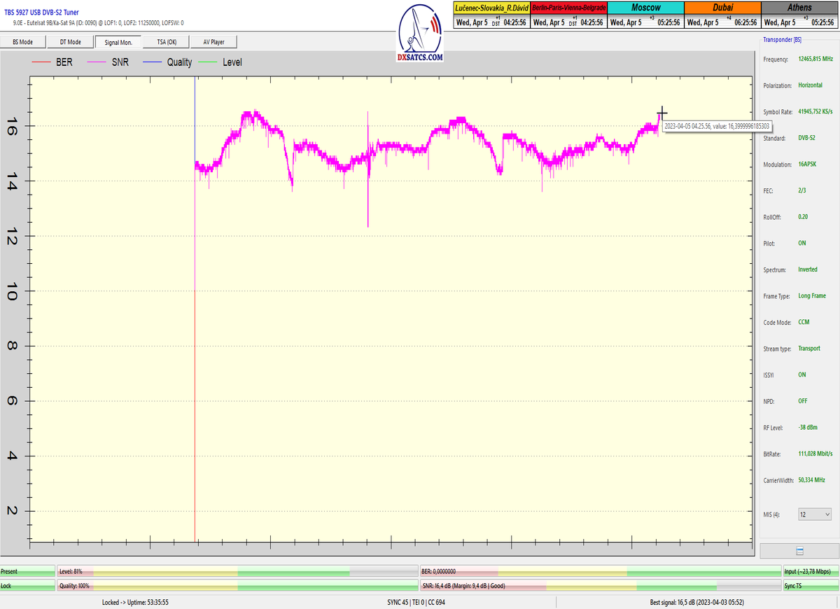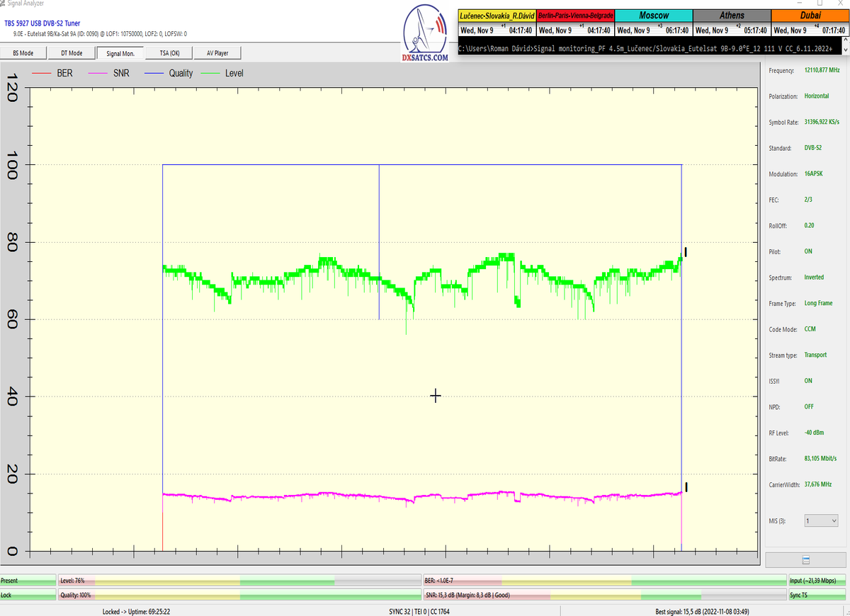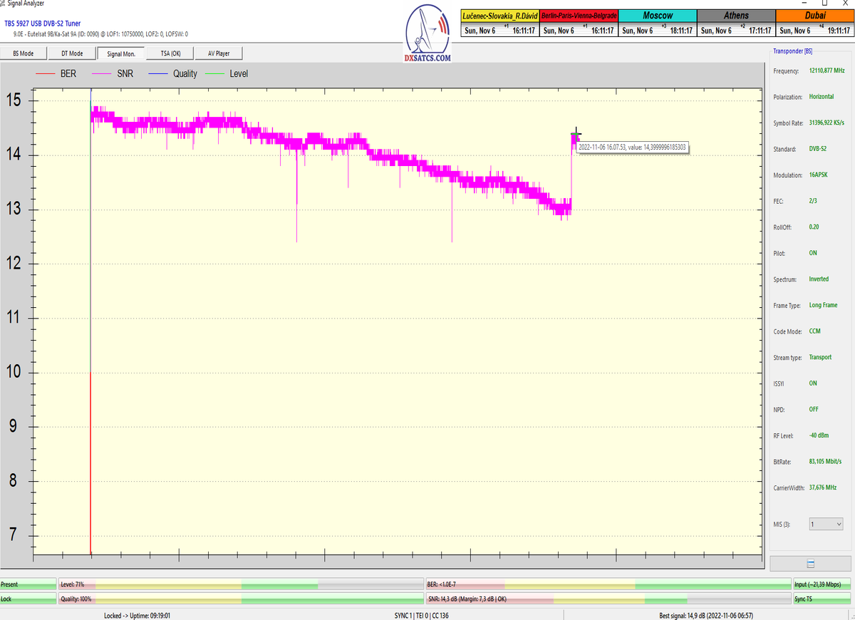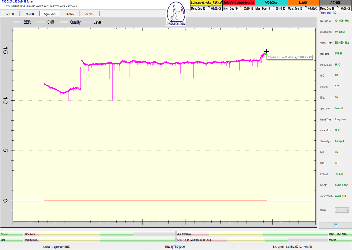 ►8.2.2023 : Na príklade dokazovania v signálnom monitoringu v dĺžke 1x73 hodín dnes nespochybniteľne dokážem začlenenie frekvencie f=12 188 MHz_V do DTH kategorizácie štandardnej formy konštantne stabilného satelitného príjmu (99,999%) s doteraz najvyššou špičkou kvality okolo SNR=15,8 dB ktorá sa opakuje každý deň.Z technologickej stránky je príjem z TP IT3 výnimočný hlavne tým že veľkosť uhlovej odchýlky SKEW ostáva konštantná aj pri výrazných zmenách v poveternostných podmienkach.Ďalej dnes dokážem plnú stabilitu príjmu v štandarde DVBS2-16APSK-Multistream aj pri intenzívnom snežení dňa 27.1.2023 so stabilnou výškou kvality okolo SNR=14,3 dB atď