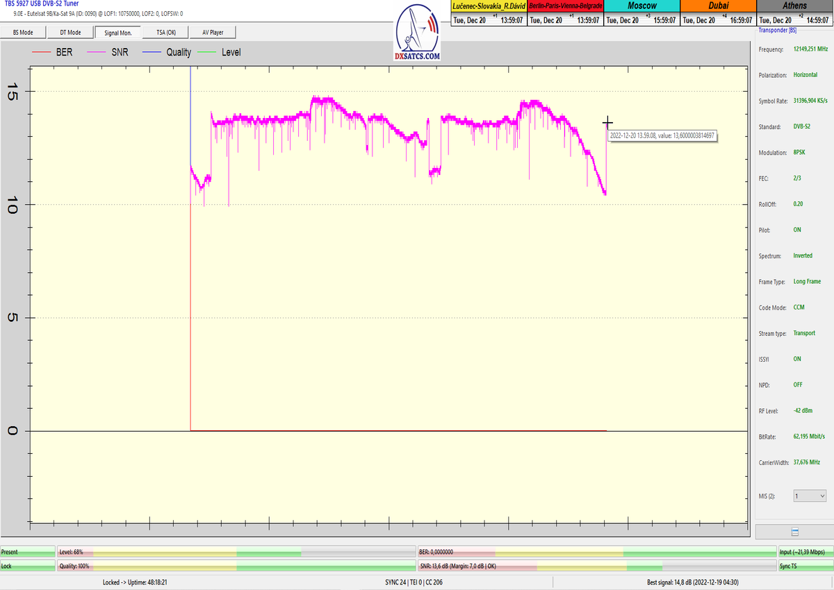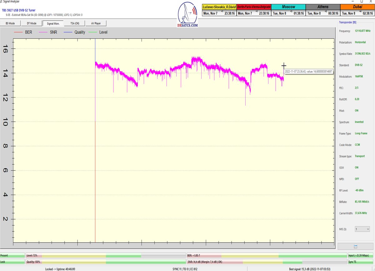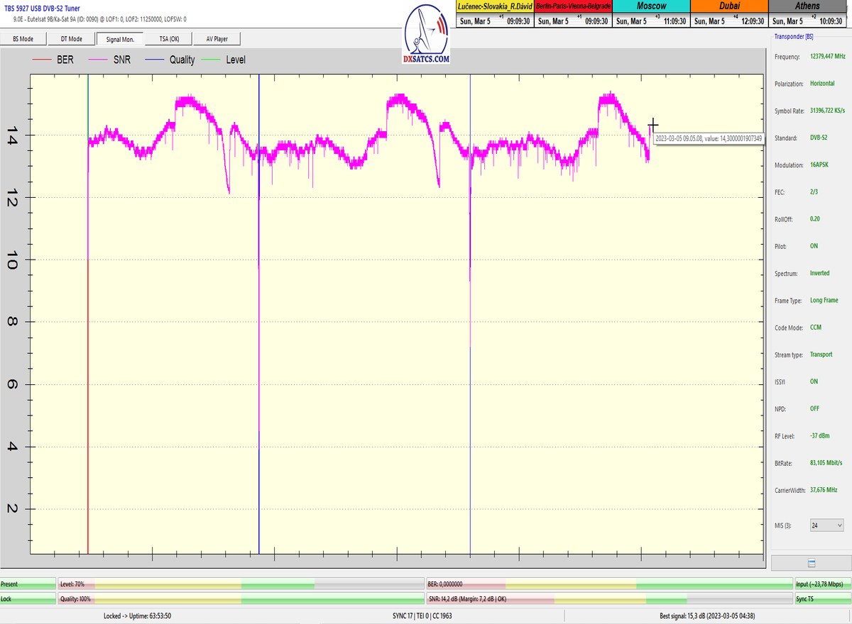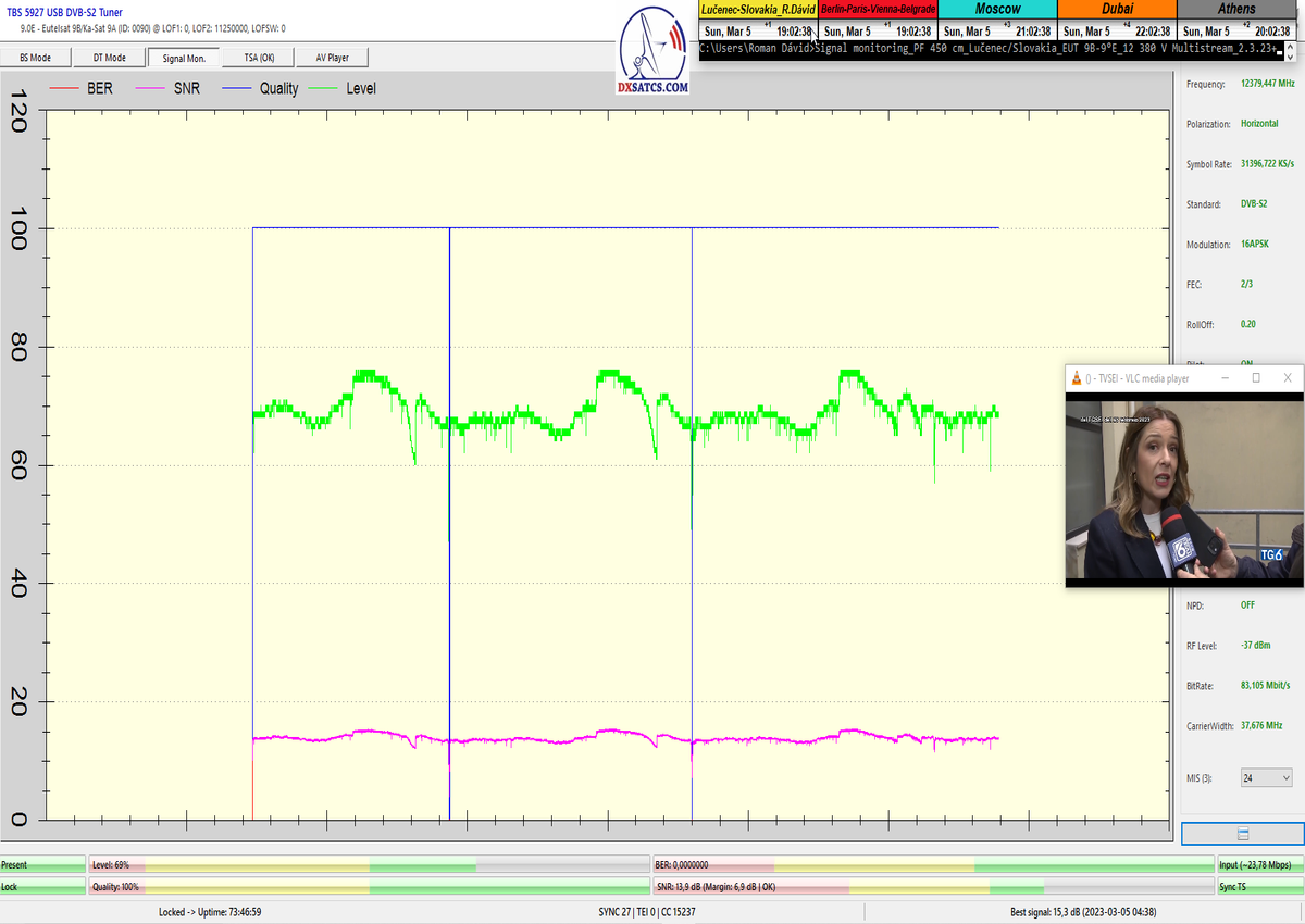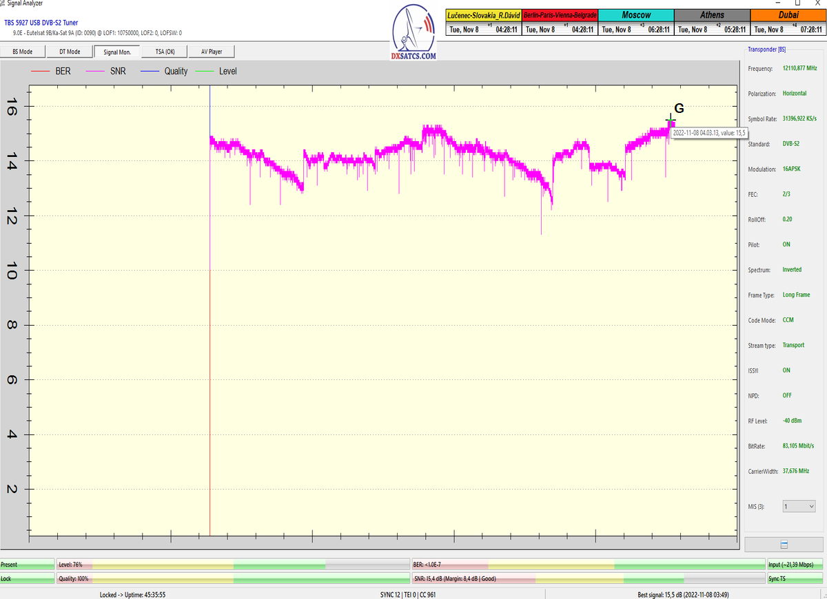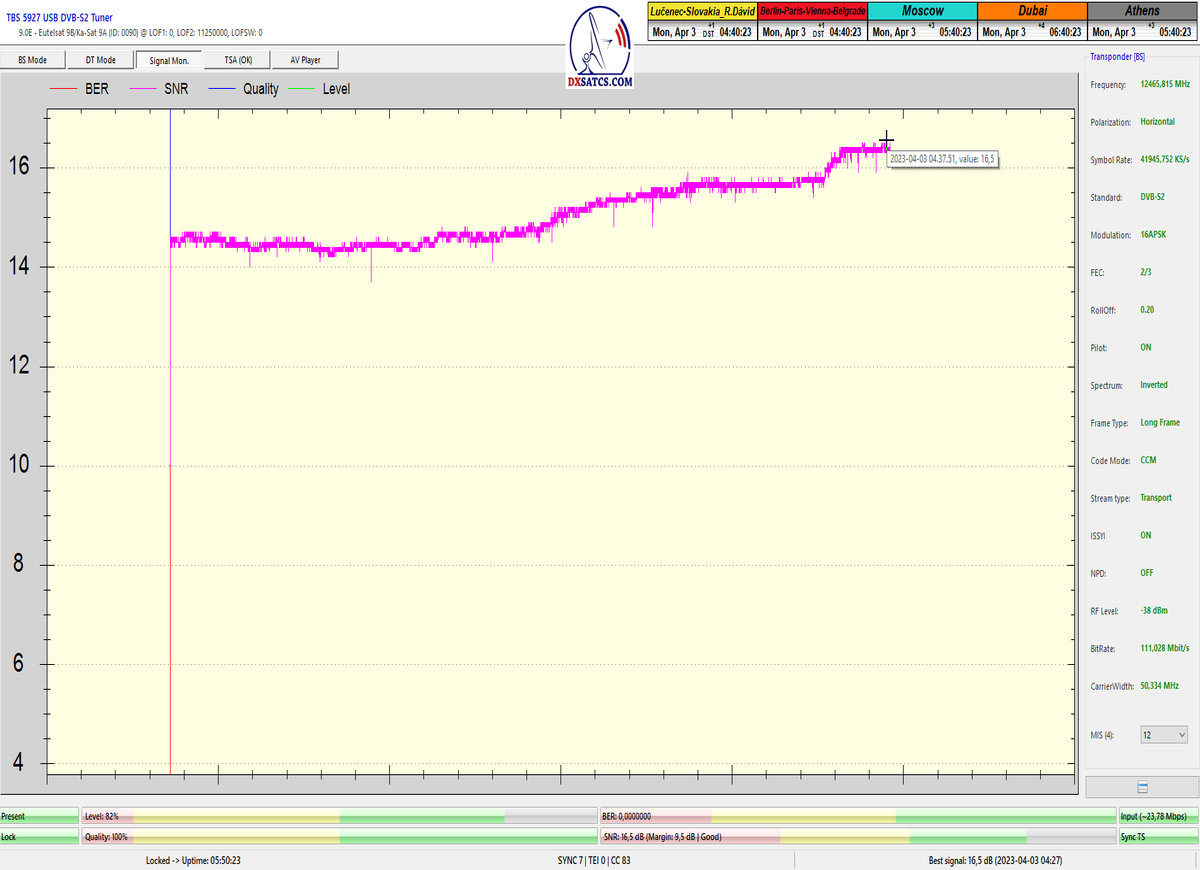 ►8.2.2023 : Na príklade dokazovania v signálnom monitoringu v dĺžke 1x73 hodín dnes nespochybniteľne dokážem začlenenie frekvencie f=12 188 MHz_V do DTH kategorizácie štandardnej formy konštantne stabilného satelitného príjmu (99,999%) s doteraz najvyššou špičkou kvality okolo SNR=15,8 dB ktorá sa opakuje každý deň.Z technologickej stránky je príjem z TP IT3 výnimočný hlavne tým že veľkosť uhlovej odchýlky SKEW ostáva konštantná aj pri výrazných zmenách v poveternostných podmienkach.Ďalej dnes dokážem plnú stabilitu príjmu v štandarde DVBS2-16APSK-Multistream aj pri intenzívnom snežení dňa 27.1.2023 so stabilnou výškou kvality okolo SNR=14,3 dB atď