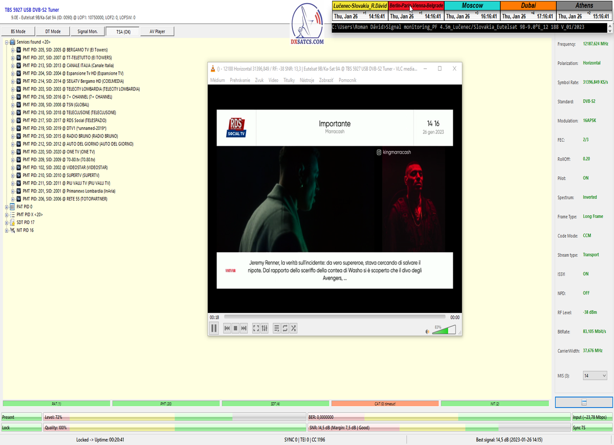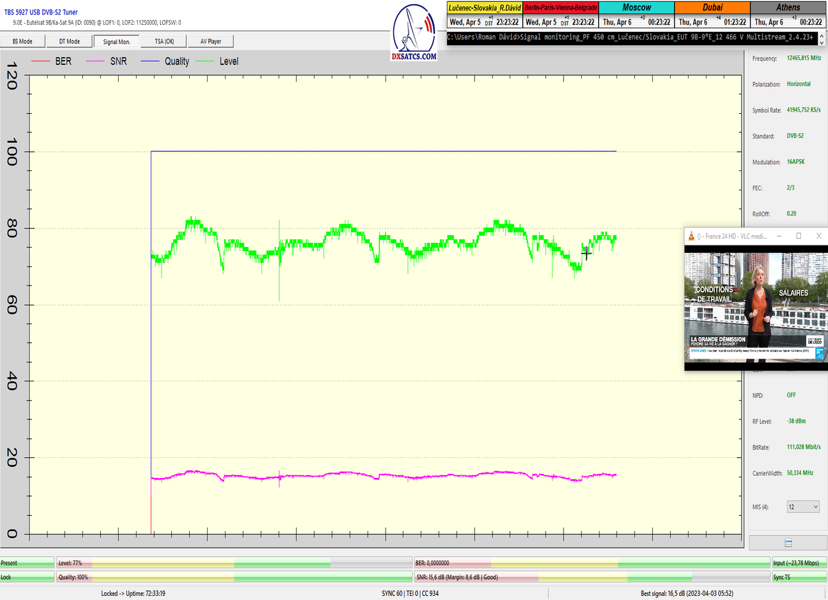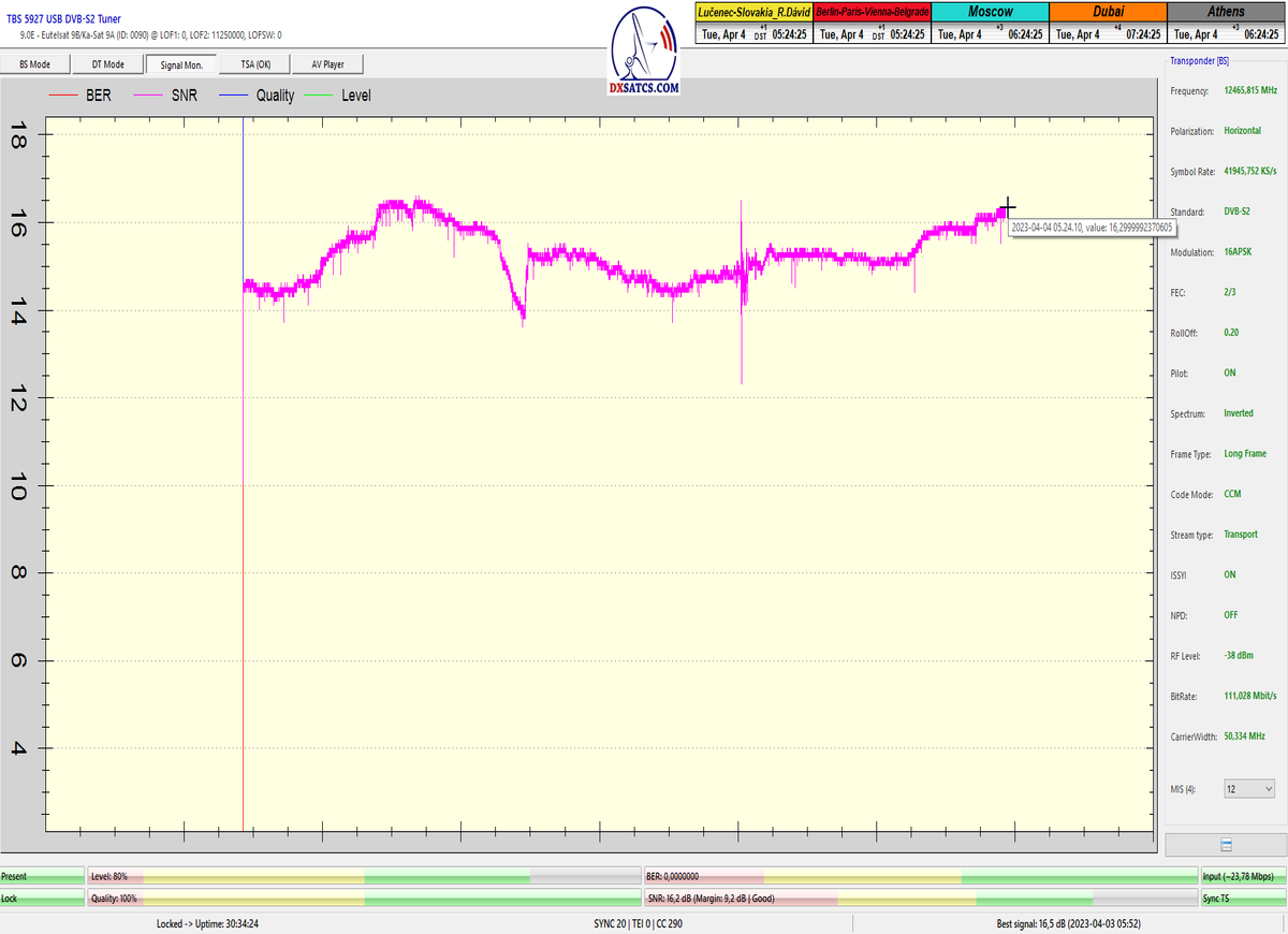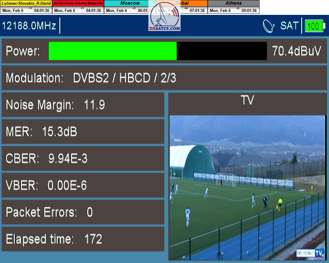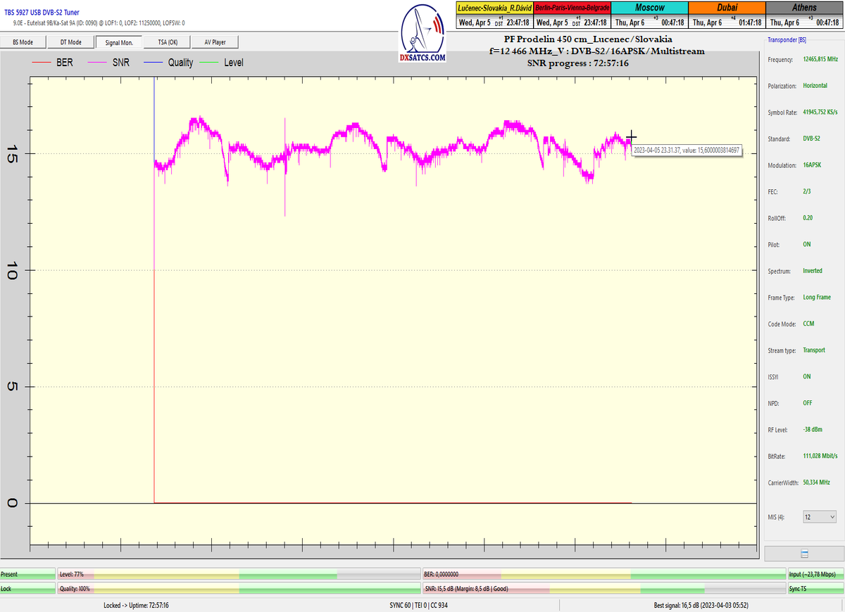 ►8.2.2023 : Na príklade dokazovania v signálnom monitoringu v dĺžke 1x73 hodín dnes nespochybniteľne dokážem začlenenie frekvencie f=12 188 MHz_V do DTH kategorizácie štandardnej formy konštantne stabilného satelitného príjmu (99,999%) s doteraz najvyššou špičkou kvality okolo SNR=15,8 dB ktorá sa opakuje každý deň.Z technologickej stránky je príjem z TP IT3 výnimočný hlavne tým že veľkosť uhlovej odchýlky SKEW ostáva konštantná aj pri výrazných zmenách v poveternostných podmienkach.Ďalej dnes dokážem plnú stabilitu príjmu v štandarde DVBS2-16APSK-Multistream aj pri intenzívnom snežení dňa 27.1.2023 so stabilnou výškou kvality okolo SNR=14,3 dB atď