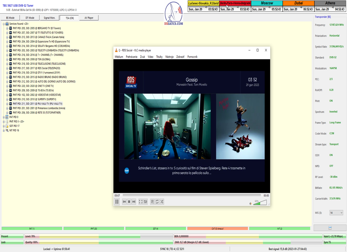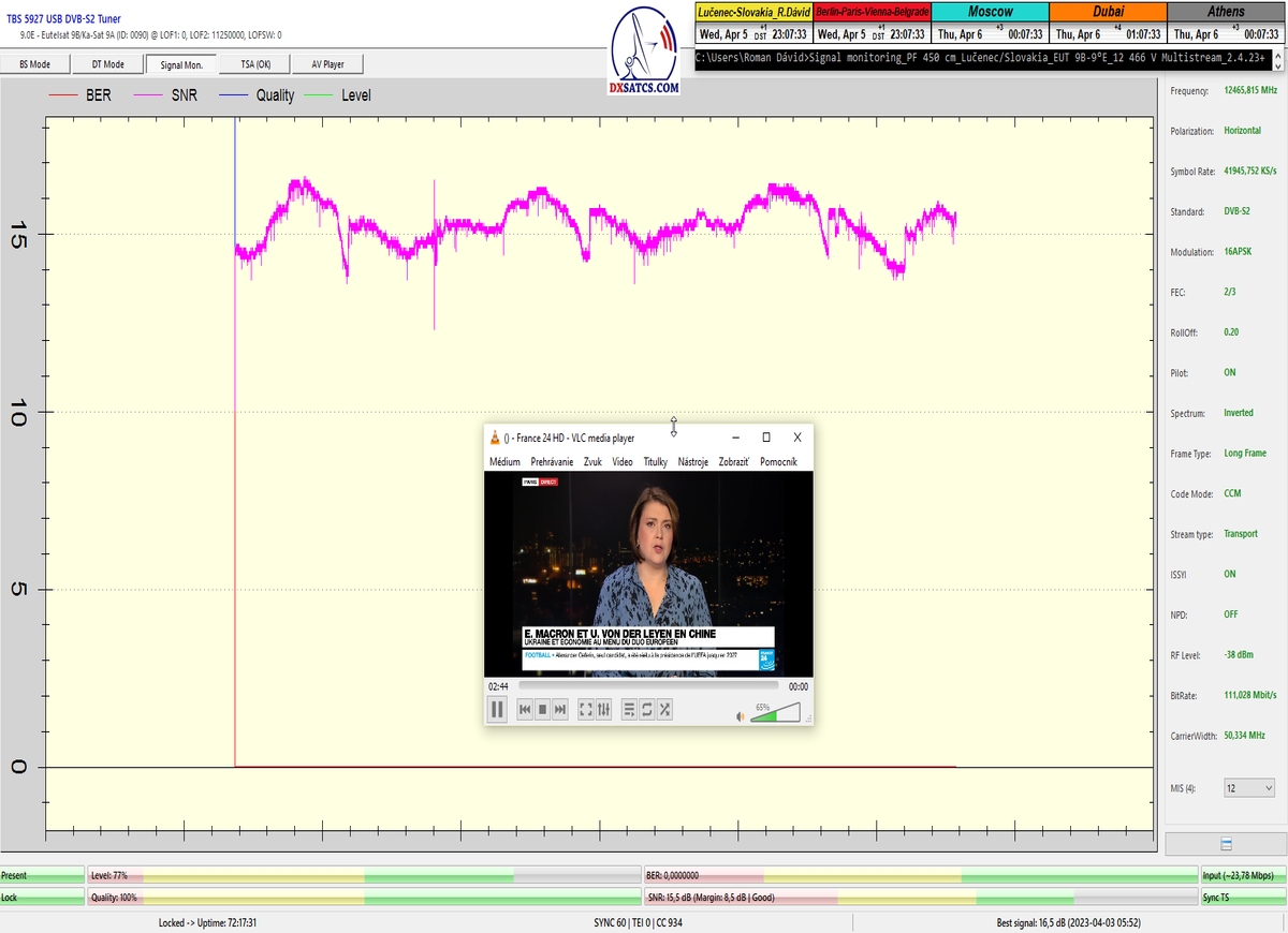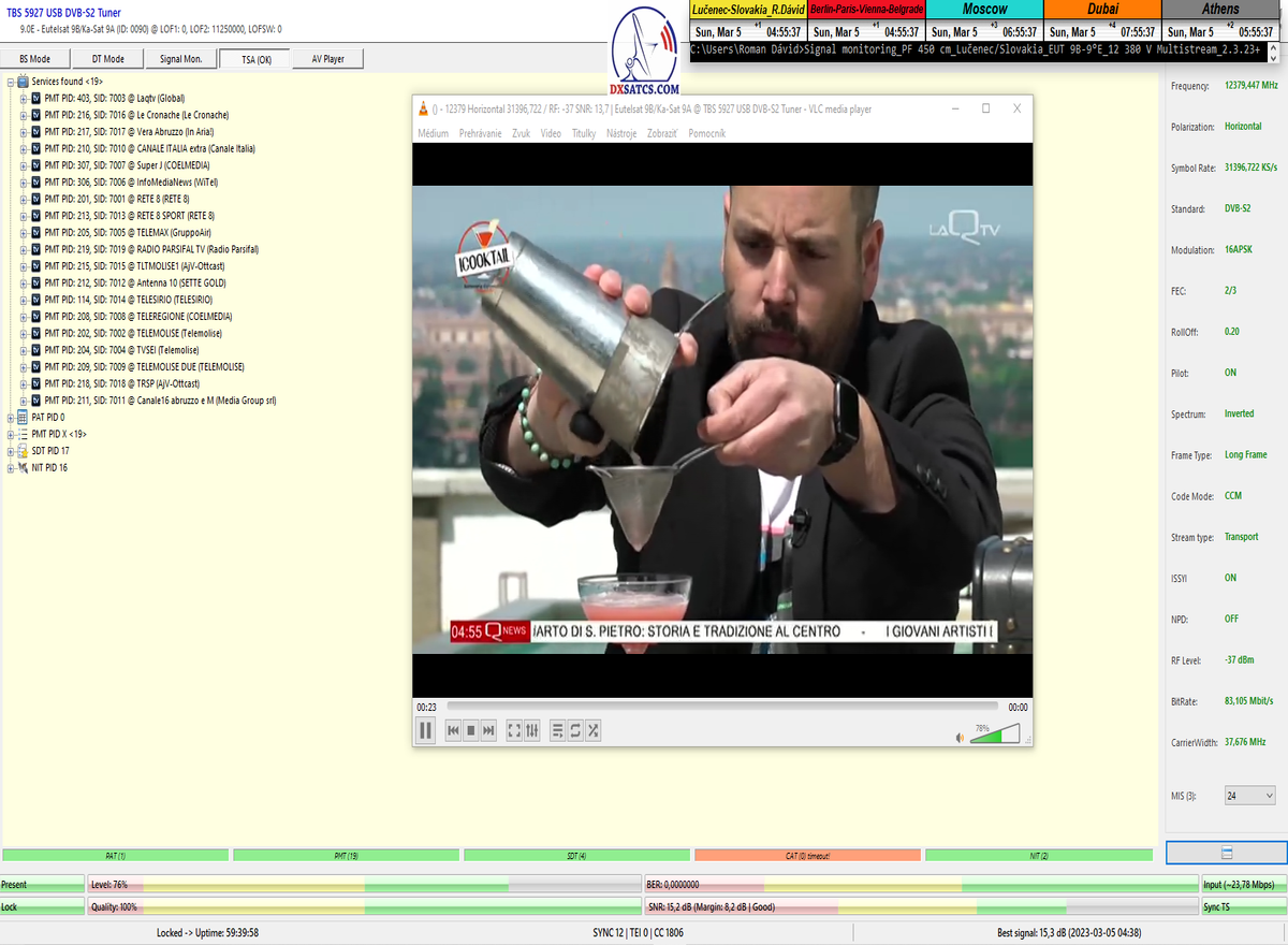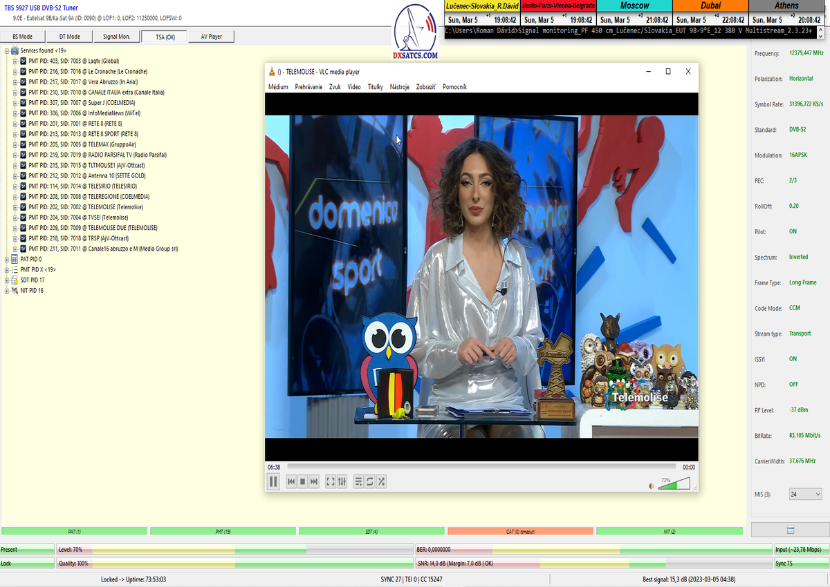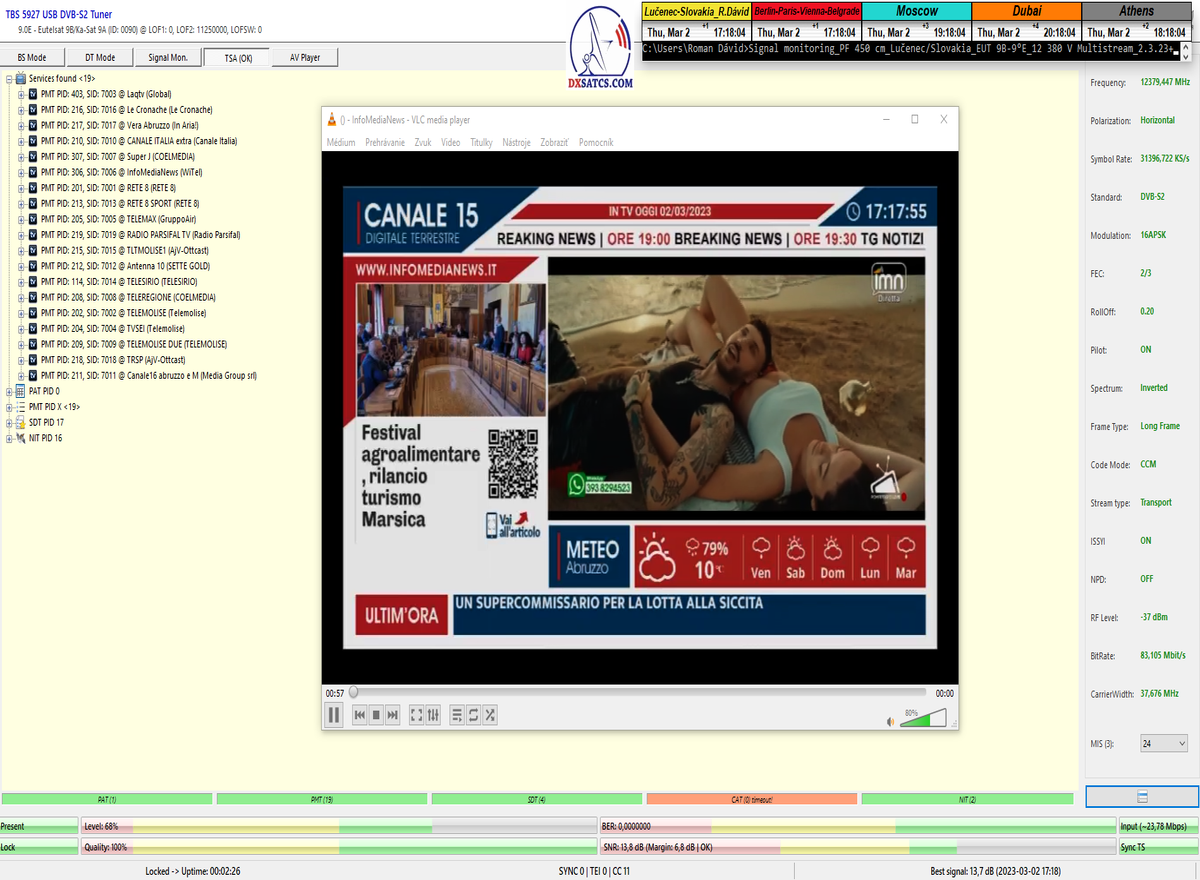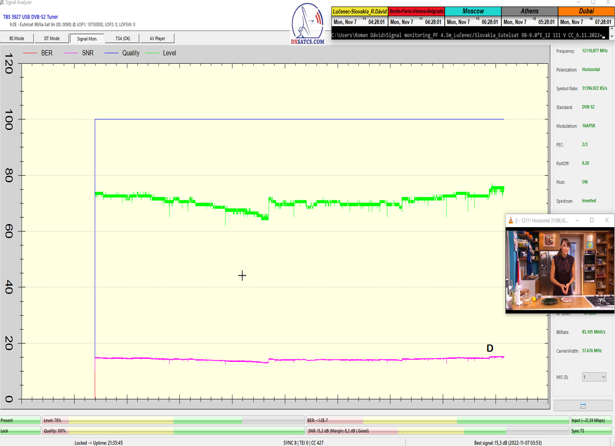 ►8.2.2023 : Na príklade dokazovania v signálnom monitoringu v dĺžke 1x73 hodín dnes nespochybniteľne dokážem začlenenie frekvencie f=12 188 MHz_V do DTH kategorizácie štandardnej formy konštantne stabilného satelitného príjmu (99,999%) s doteraz najvyššou špičkou kvality okolo SNR=15,8 dB ktorá sa opakuje každý deň.Z technologickej stránky je príjem z TP IT3 výnimočný hlavne tým že veľkosť uhlovej odchýlky SKEW ostáva konštantná aj pri výrazných zmenách v poveternostných podmienkach.Ďalej dnes dokážem plnú stabilitu príjmu v štandarde DVBS2-16APSK-Multistream aj pri intenzívnom snežení dňa 27.1.2023 so stabilnou výškou kvality okolo SNR=14,3 dB atď