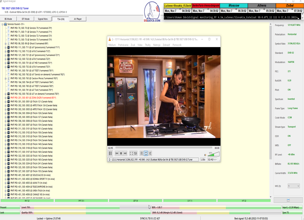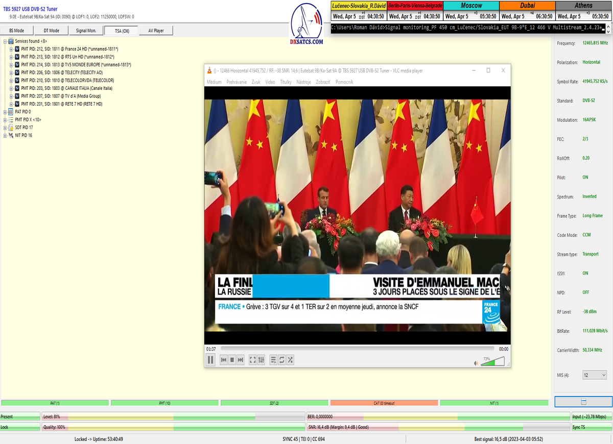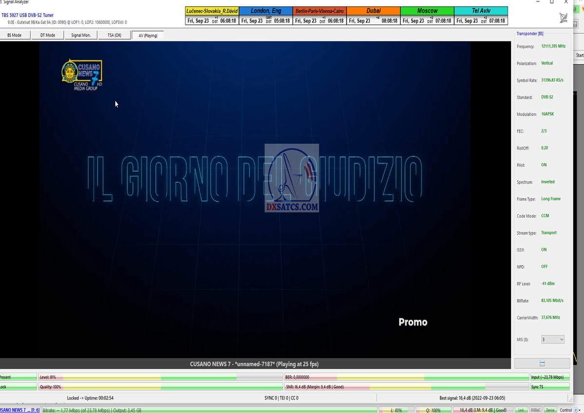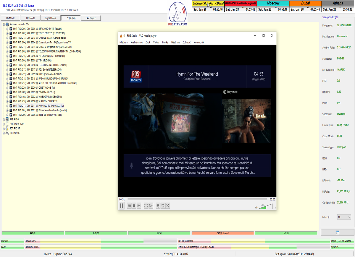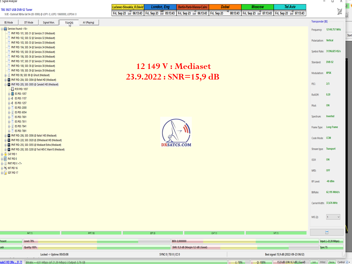 ►8.2.2023 : Na príklade dokazovania v signálnom monitoringu v dĺžke 1x73 hodín dnes nespochybniteľne dokážem začlenenie frekvencie f=12 188 MHz_V do DTH kategorizácie štandardnej formy konštantne stabilného satelitného príjmu (99,999%) s doteraz najvyššou špičkou kvality okolo SNR=15,8 dB ktorá sa opakuje každý deň.Z technologickej stránky je príjem z TP IT3 výnimočný hlavne tým že veľkosť uhlovej odchýlky SKEW ostáva konštantná aj pri výrazných zmenách v poveternostných podmienkach.Ďalej dnes dokážem plnú stabilitu príjmu v štandarde DVBS2-16APSK-Multistream aj pri intenzívnom snežení dňa 27.1.2023 so stabilnou výškou kvality okolo SNR=14,3 dB atď