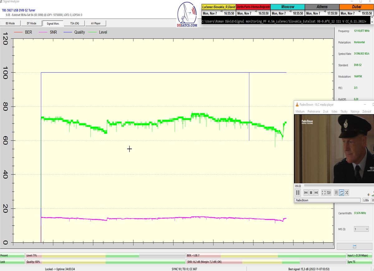 ►Priebežné stavy v signálnom monitoringu na f=12 341 MHz_V sa dokazujú v online video ukážkach,ktoré sa nedajú spochybniť.Kedže z principiálneho hľadiska platí že "Všetko sa dá spochybniť" moje argumenty znejú nasledovne : Signál s dostatočnou kvalitou sa nedá "svojpomocne vyrobiť " a priebehy a okamžité úrovne SNR,BER,Pwr... demonštrované v online video ukážkach sa nedajú zobrazovať a ani dodatočne upravovať v OFF-LINE režime,pretože ten neexistuje.To je dôvod prečo tak zdôrazňujem slovo ONLINE video ukážka