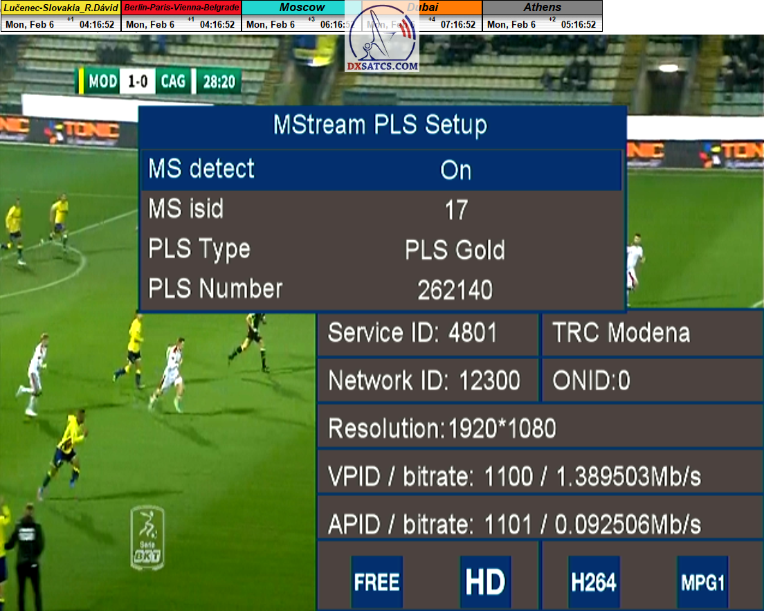 > PARAMETRE PRENOSU : DVB-S2 _ 16APSK _ SR=41 950 _ FEC=2/3 _ PLS Gold 262140 _ Multistream 12-13-17-23 <