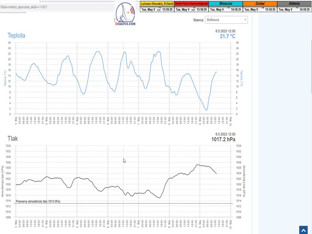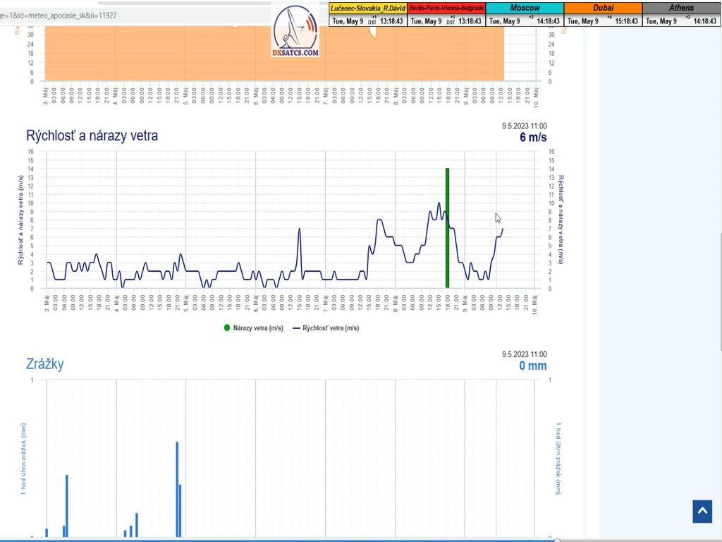 ►Stav atmosféry : na základe meteogramov zo zdrojov shmu.sk môžem potvrdiť že počas troch monitorovaných úsekov od 7 do 9.5.2023 prevládalo jasno až polojasno bez zrážok,pri nadpriemerne vysokej rýchlosti vetra okolo 9 m/s dňa 8.5.2023 a vonkajšej teplote od 10 do 21°C.