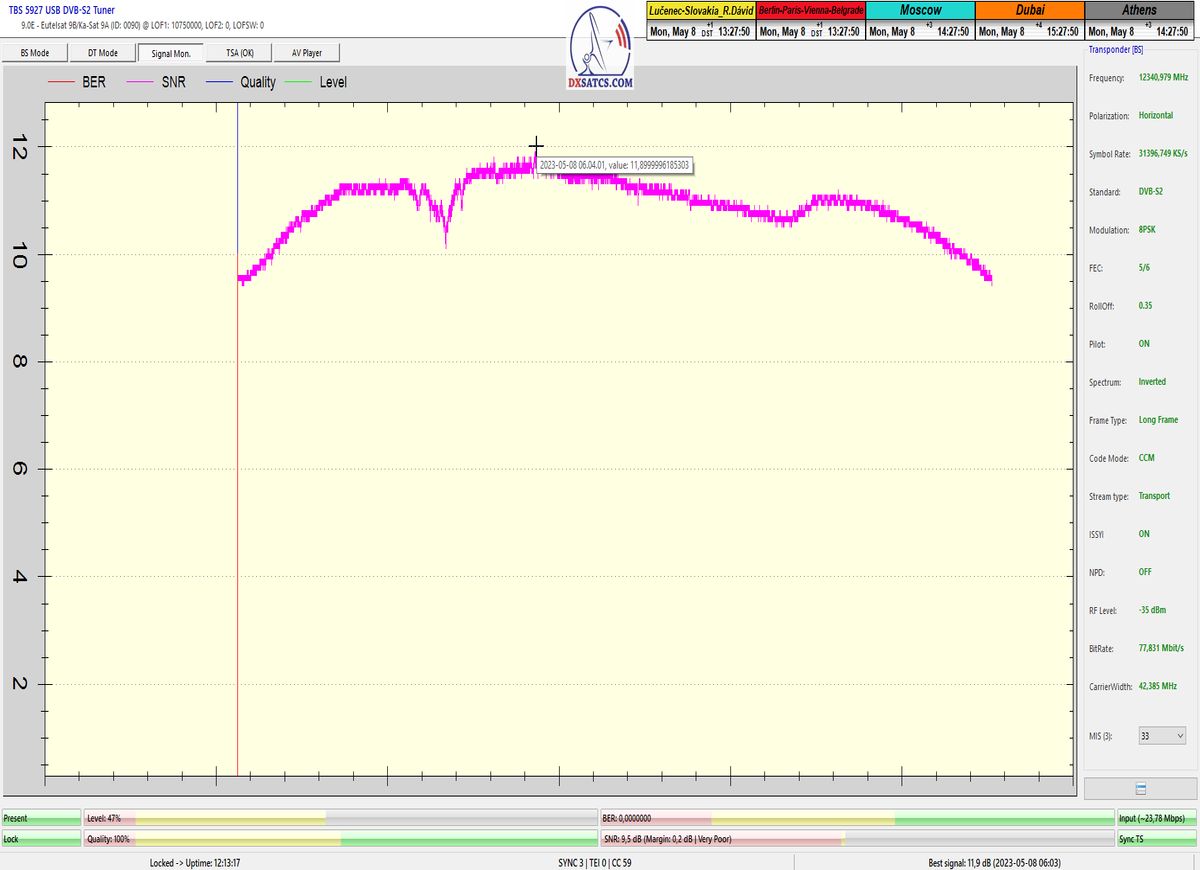 Terminológiou signálneho monitoringu a polopatisticky povedané : Vo výkonovom modele Jar/Leto dokážem (za predpokladu extrémne nedegradujúcich poveternostných podmienok) v praxi naplniť stabilnú formu príjmu v minimálnej a každodennej dĺžke t=12 hodín, odvodenú od minimálnej ale stabilenej výšky rezervy od 0,2 dB o 01:15 CET v noci až do 2,3 dB okolo 6:00 ráno. Pravdivosť mojich predchádzajúcich tvrdení o stabilnej forme príjmu z f=12 341 MHz_V v minimálnej dĺžke t=12 hodín každý deň dokazujú 3 priebehy signálneho monitoringu vyhotovené od siedmeho do deviateho mája 2023 a tentoraz bez publikovaného dôkazu môžem potvrdiť že výška špičky kvality okolo SNR=11,8 dB a dĺžka "otvoreného" signálneho okna pre stabilný príjem je porovnatelná s rokom 2022,čiže z hľadiska intenzity výkonu EIRP medziročne nedochádza k prudkým zmenám v danom zemepisnom mieste.