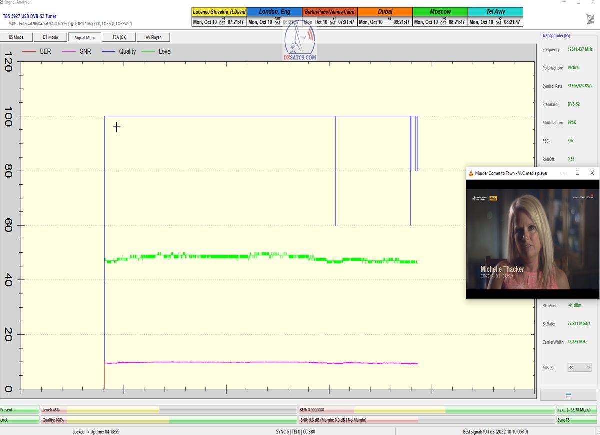 Dosiahol som nestabilný alebo z hľadiska dĺžky 24 hodín nekontinuálny priebeh LOCKU,ktorý pozostáva z dokázateľne jedného signálneho okna, ktoré je každodenne "otvorené" v minimálnej dĺžke 12 hodín od približne 01:15 do 13:30 CET,v ktorom som dokázateľne alebo inak tri dni po sebe,dosiahol plne stabilnú formu príjmu bez výpadkov a pixelácií klasifikovanú tvrdením : stabilný na 99,999-100%.