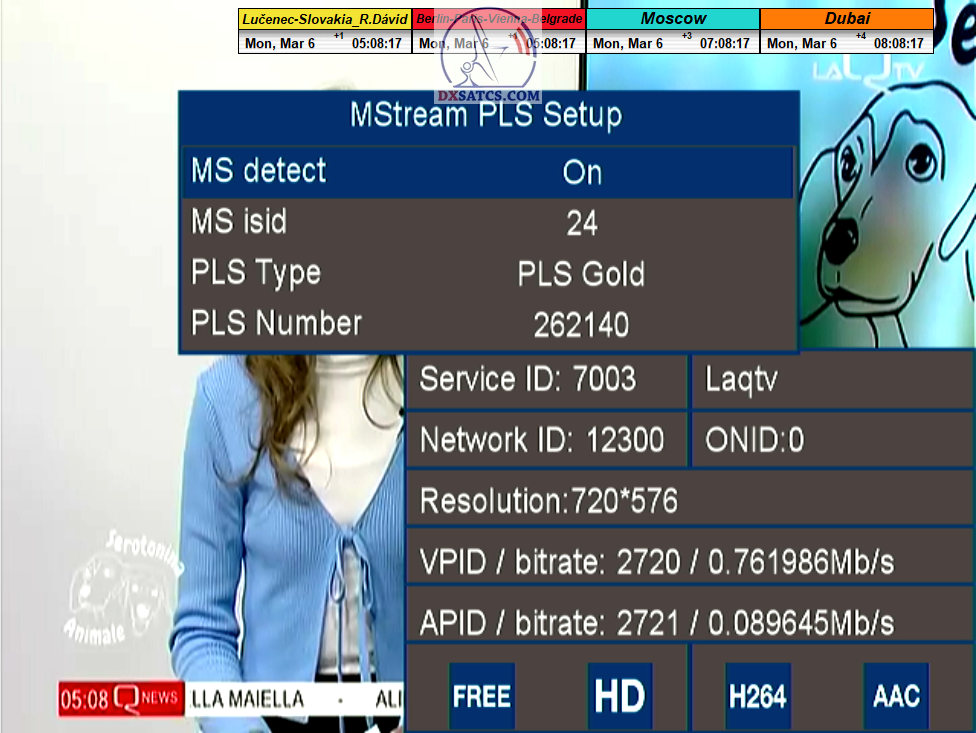 > PARAMETRE PRENOSU : DVB-S2 _ 8APSK _ SR=31 400 _ FEC=5/6 _ PLS Gold 0 _ Multistream 33-35-36 <