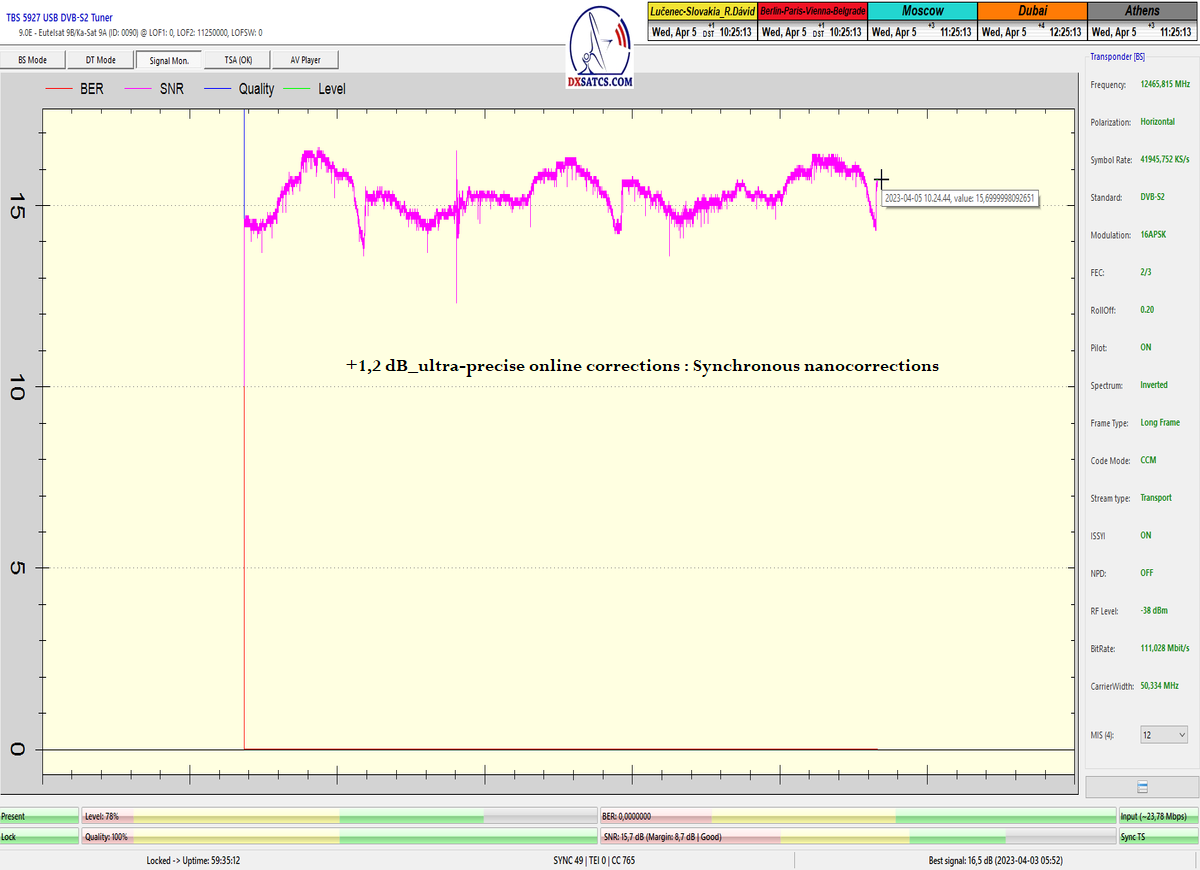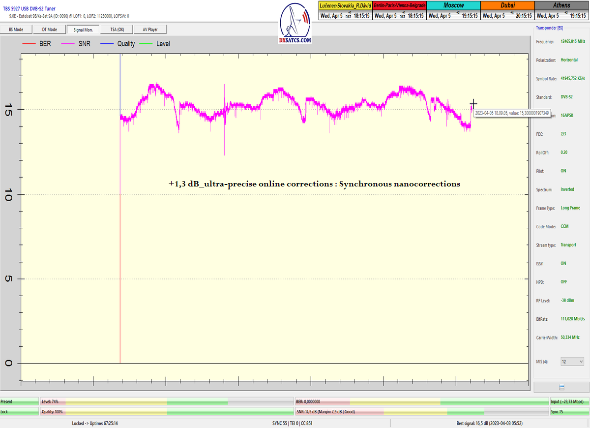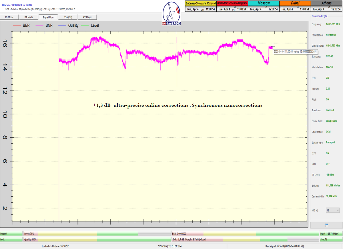 -B- : Výkon autorovej technológie "Synchrónne nanokorekcie" : dokázaný rast kvality o 3 dB_z cca 11 dB na cca 14,0 dB_SNR -skoková a nie postupná zmena v kvalite,v priebehu približne piatich sekúnd,je dôkazom že autor nehľadá/netipuje optimálnu pozíciu v danom čase pre rast kvality,ale vie úplne presne o koľko uhlových minút až sekúnd je v tom čase nutný výkon korekcií pre rast v kvalite o 3 dB.
