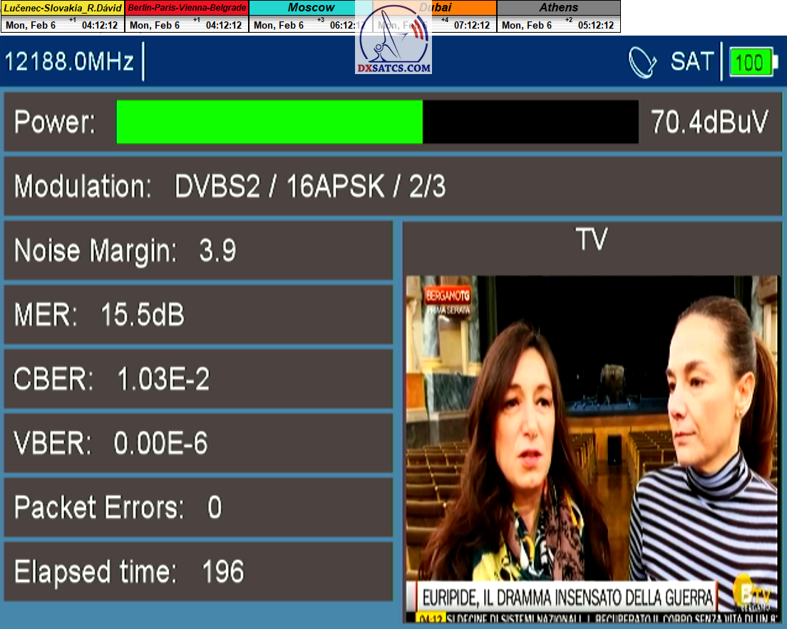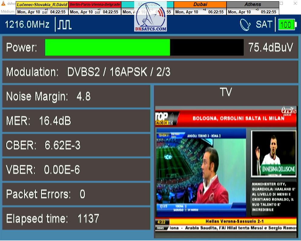 ►v signálnom monitoringu dokázaný a plne stabilný príjem bez jediného výpadku za jednotku t=72 hodín,pri častých dažďových prehánkach a každodenne dosiahnutá špička kvality okolo SNR=13,8 dB s tunerom TBS 5925/5927 alebo okolo MER=14,2 s analyzátorom Metek HD na f=12 111 V .