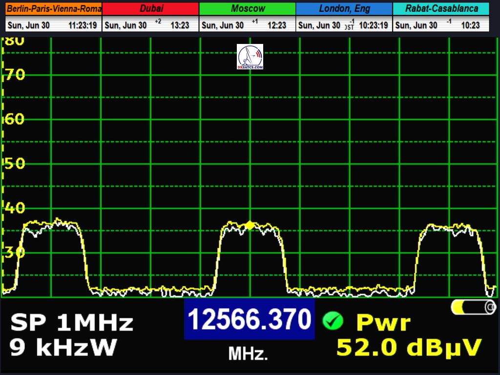 radio carrier Q-Music NL AMS at f=12,567.994 MHz through LOF2 and 12,567.941 MHz through LOF1, resulting in an offset of exactly 53 kHz between