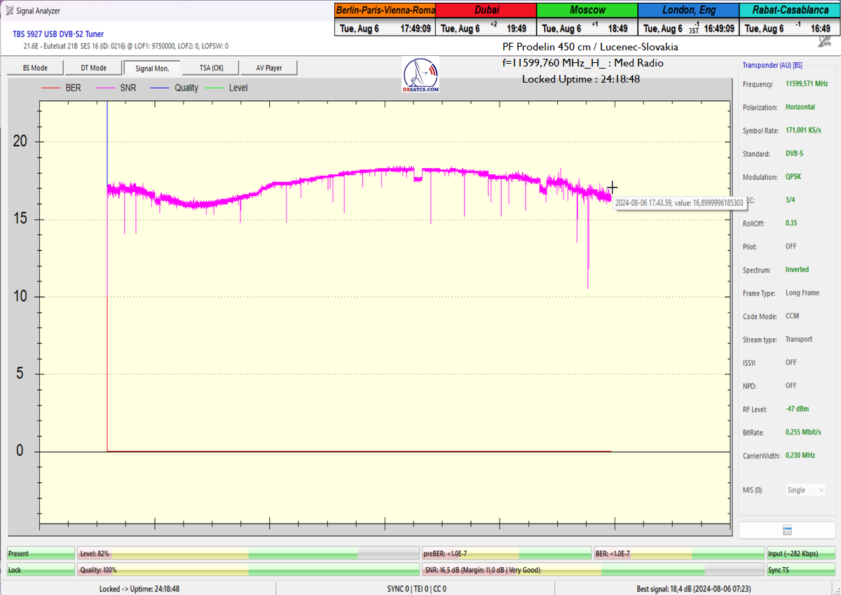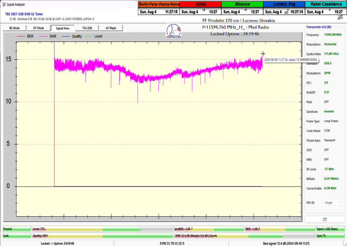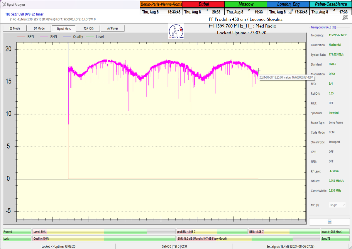 ►Eng_Classification of achieved results at f=11 599,760 MHz: Signal monitoring over a unit length of t=72 hours irrefutably proves that I have achieved 100% reception stability in practice, without a single interruption in Lock continuity throughout the entire monitoring period. The daily peak quality oscillated around an SNR of 18.4 dB, which provides an immediate quality margin of nearly 13 dB with, of course, a zero level of Viterbi Precorrection <1.0E-7. Occasional drops in instantaneous quality never exceeded an SNR of 9.7 dB.