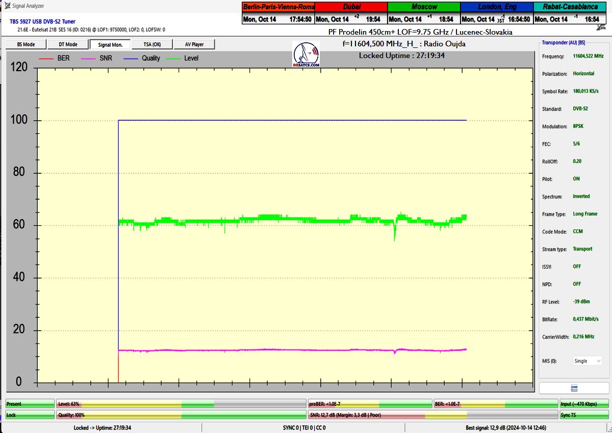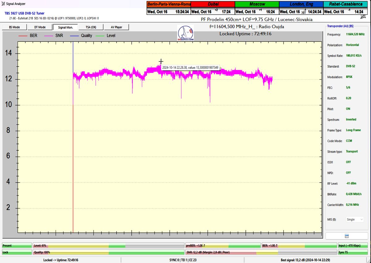 SK: EUT 21B_11 604,500 MHz-Radio Oujda : Dokázaná kontinuita funkcie locku,alebo stabilita príjmu na 100% na výstupe z PF 450+370 cm na každom z troch oscilátorov v celkovej kvantite dokazovania t=144 hodín,pre rádio nosnú s aplikovanou hodnotou Symbolovej rýchlosti SR=180 ksym/s a so špičkou kvality SNR=13,7 dB