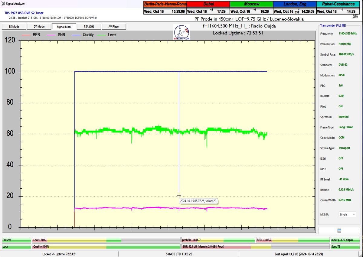 ►SK_Klasifikácia dosiahnutých výsledkov na f=11 604,500 MHz: PF 450 cm_Aj napriek výskytu dažďových prehánok v dvoch z celkovo troch dní,počas ktorých dňa 15.10.2024 o 6:07 ráno došlo k jedinému poklesu kvality Q na úroveň okolo šumového prahu Q=20%,som dokázateľne dosiahol stabilitu príjmu na 100% bez jediného výpadku v kontinuite priebehu Locku v dostatočnej jednotke monitoringu t=72 hodín.Zaznamenal som špičku kvality SNR=13,3 dB a výška signálnej rezervy počas dňa oscilovala v typickom rozsahu 2-3+ dB.Replikácia signálneho modelu do anténneho systému v podobe mojej technológie "Synchrónne nanokorekcie" bola úspešná a jej okamžitý prínos do rastu kvality predstavoval od 0,2 do 0,5+ dB +dôkaz.