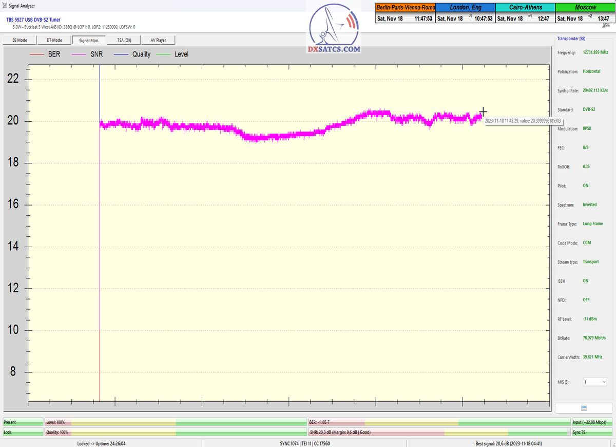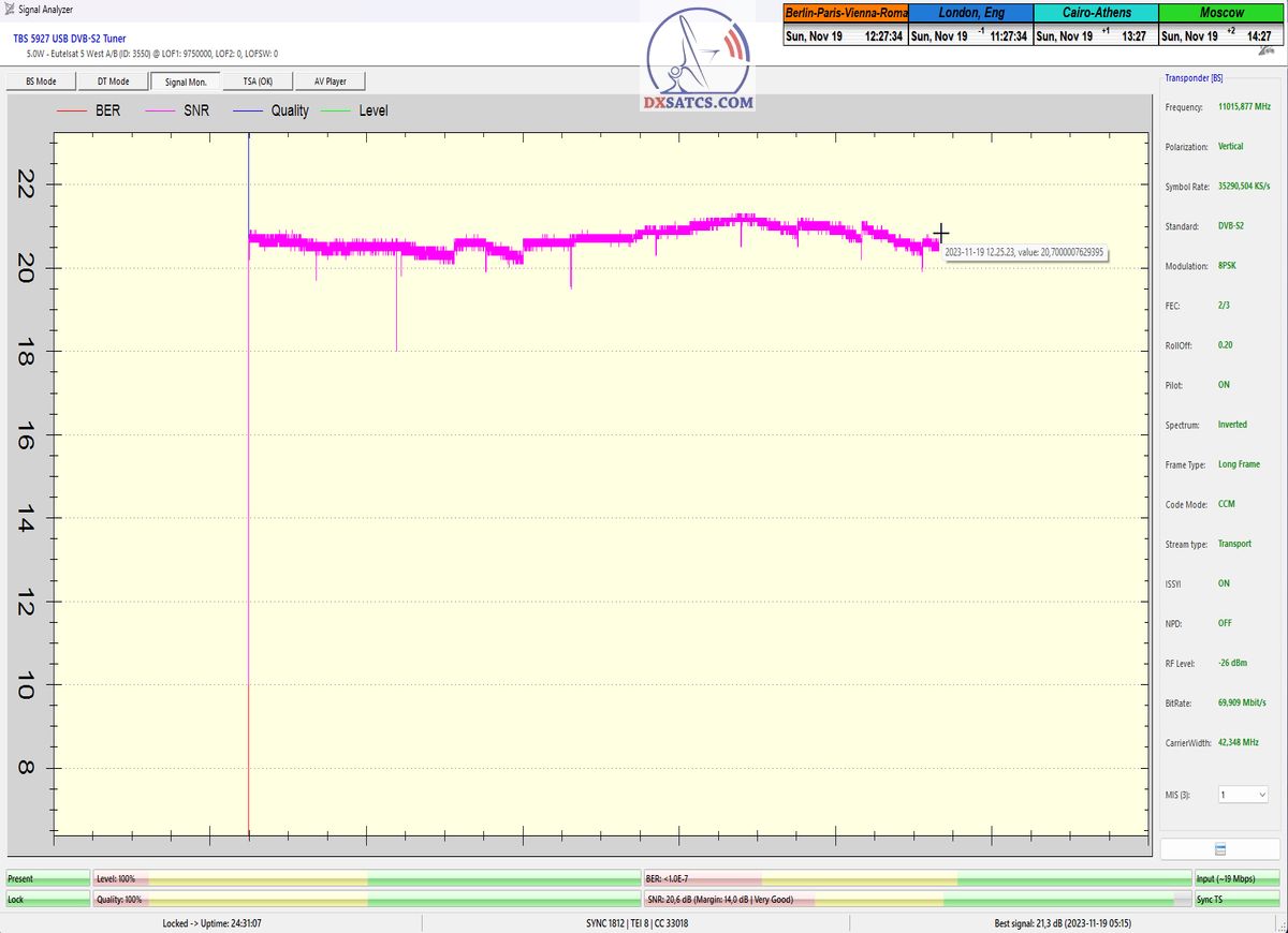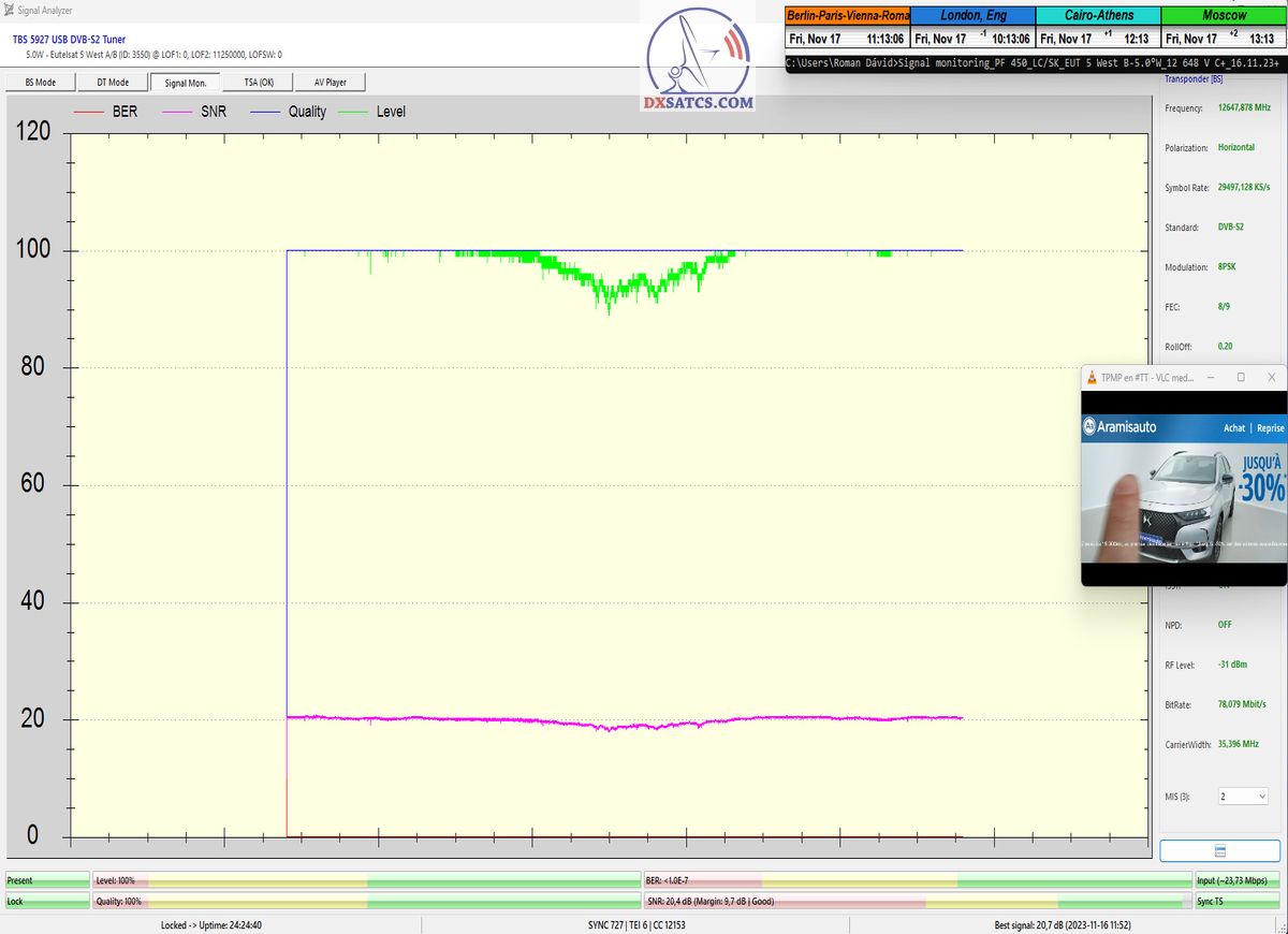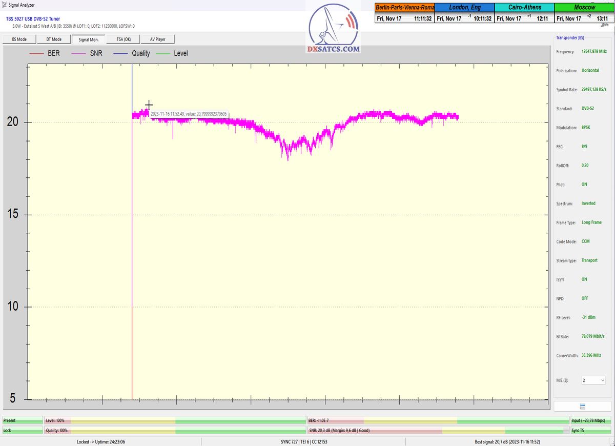 29.11.2023 :  Based on the example of proving through signal monitoring of Rai and Canal+ packets broadcast in the DVB-S2/Multistream technological standard from the Eutelsat 5 West B satellite at 5.0°W, today I can demonstrate to you that I have effectively and, above all, stably transformed the relatively high intensity of the emitted EIRP power into the resulting quality which I quantify by the signal-to-noise ratio SNR=20>21+ dB_with the used configuration of modulation parameters of the signal path DVB-S2/8PSK/FEC=2/3.Today, I will demonstrate the effectiveness with which I have managed to minimize the mutual spectral penetration or interference of the waves from the V to the H quadrant and vice versa and how it relates to the resulting reception quality. I will perform a spectrum analysis with a frequency span of only 200 kHz, visualizing the presence of two frequencies with TT&C signals etc.