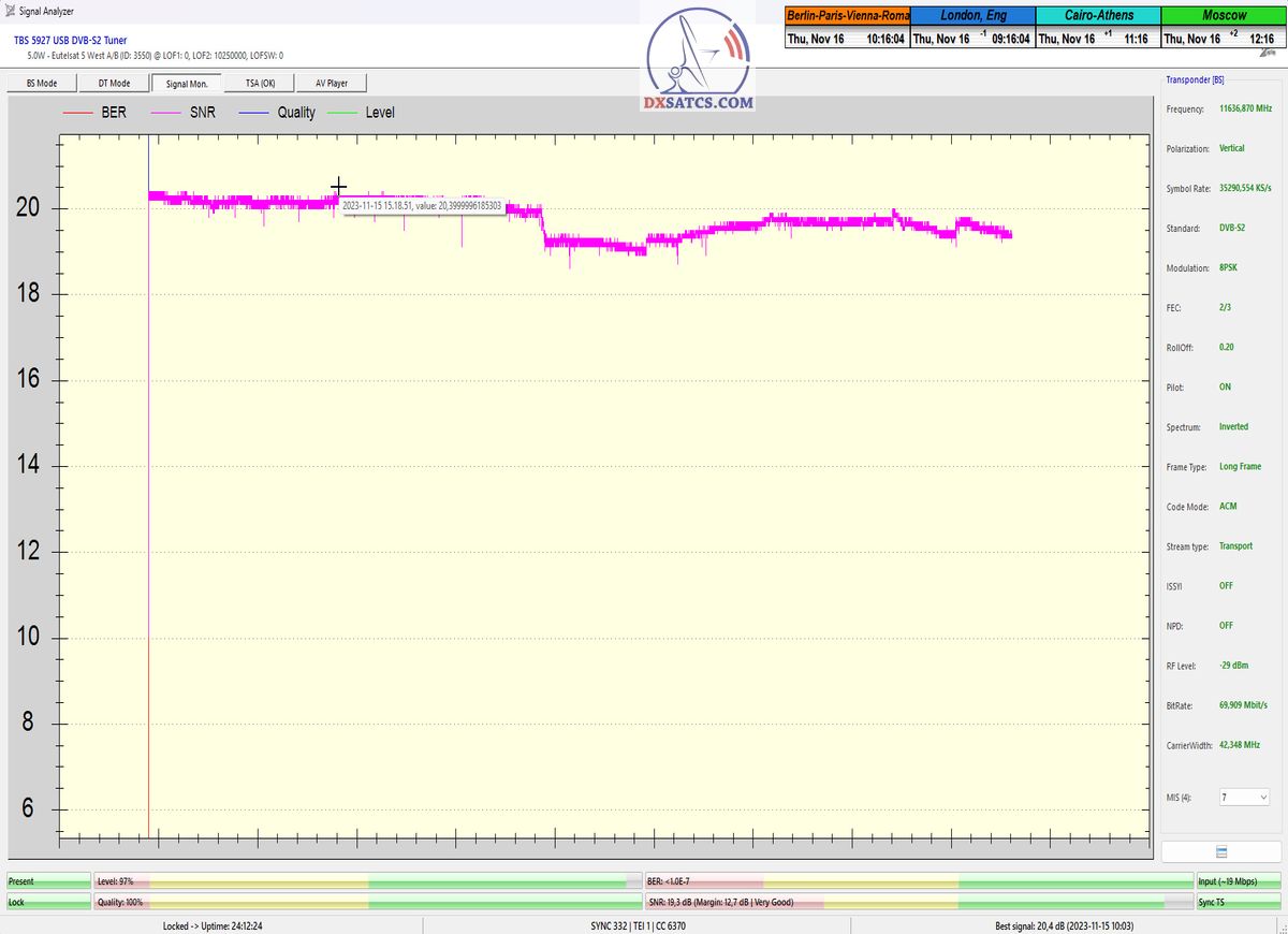 ►►Eutelsat 5 West B at 5.0°W-Transalpine-Multistream : Proving in the monitoring unit t=24 hours