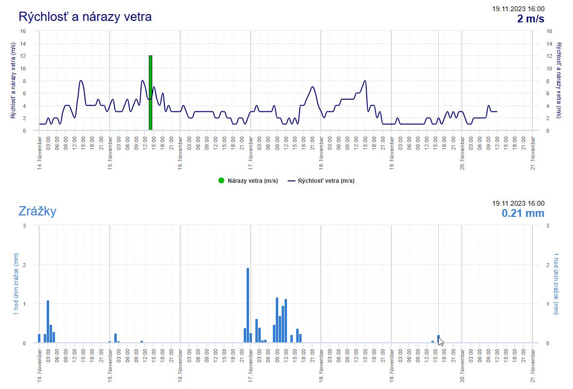►Results of wind speed and precipitation measurements for the location of the automatic meteorological station in the village of Boľkovce near Lučenec,spanning from November 13 to November 21, 2023, demonstrate that precisely in five out of the eight monitored intervals, monitoring activity was accompanied by rain showers with varying precipitation amounts.  (source : shmu.sk)