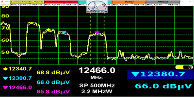 ⇒ Analýza spektra a kvality na "Monitorovanej frekvencii f=12 111 MHz_V" (TP IT1 Italian footprint) : PF Prodelin 450 cm