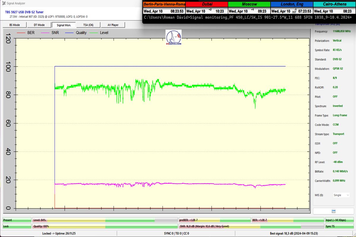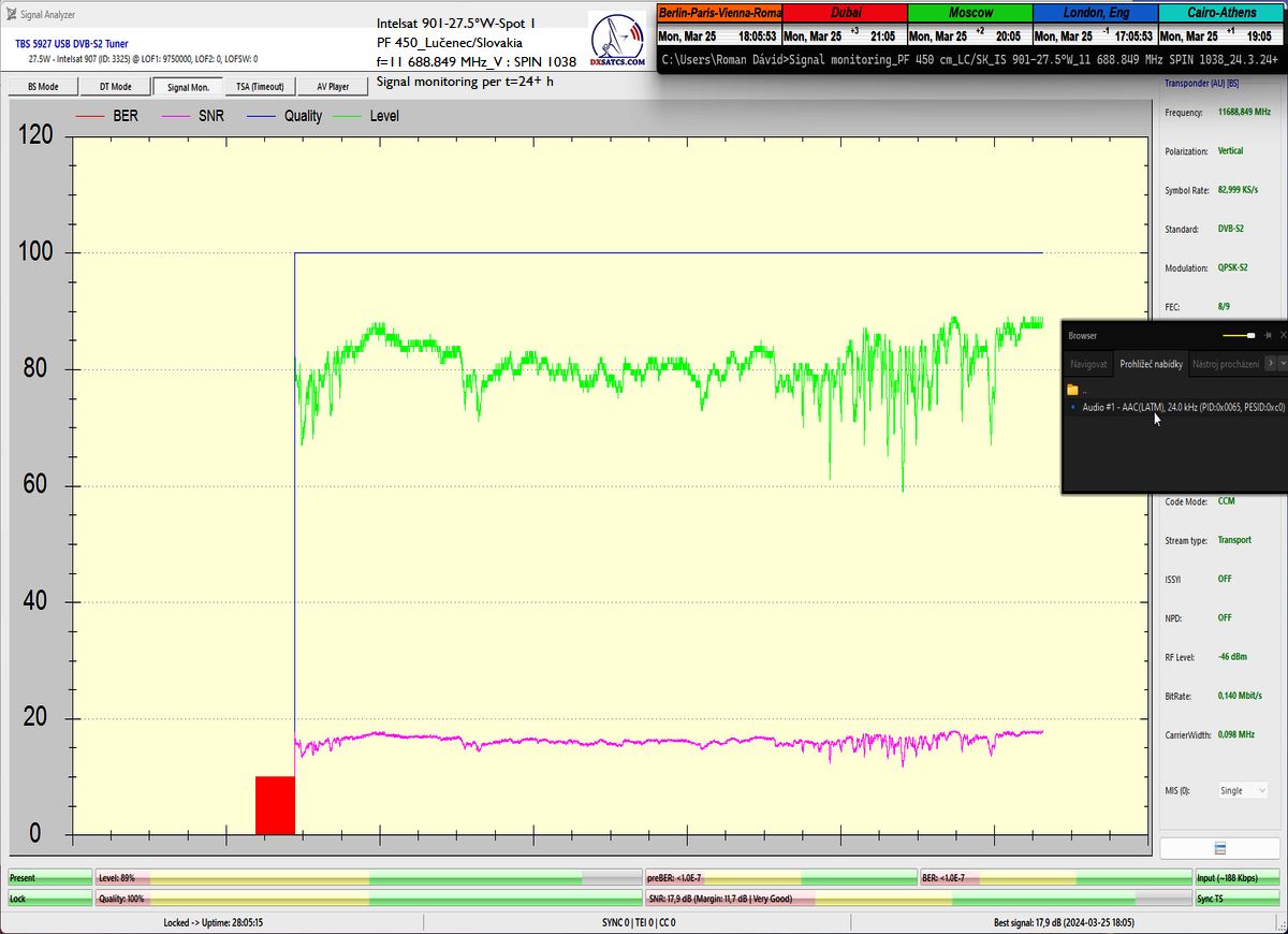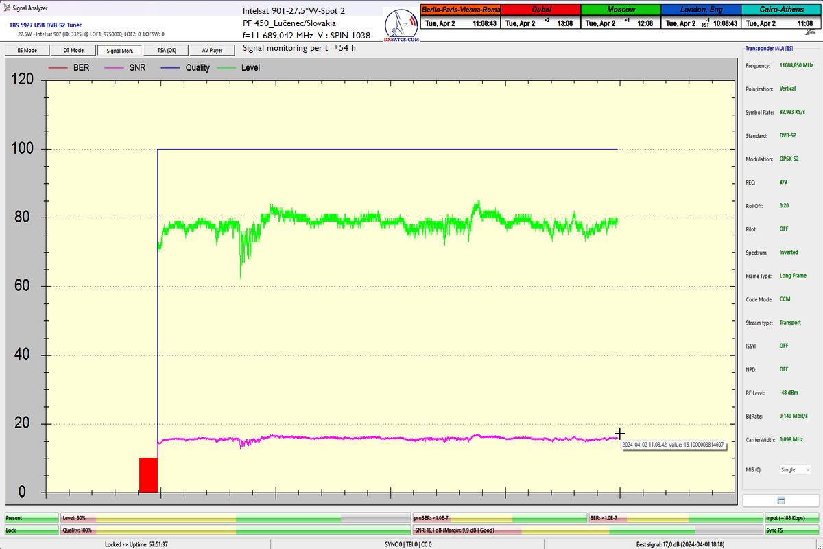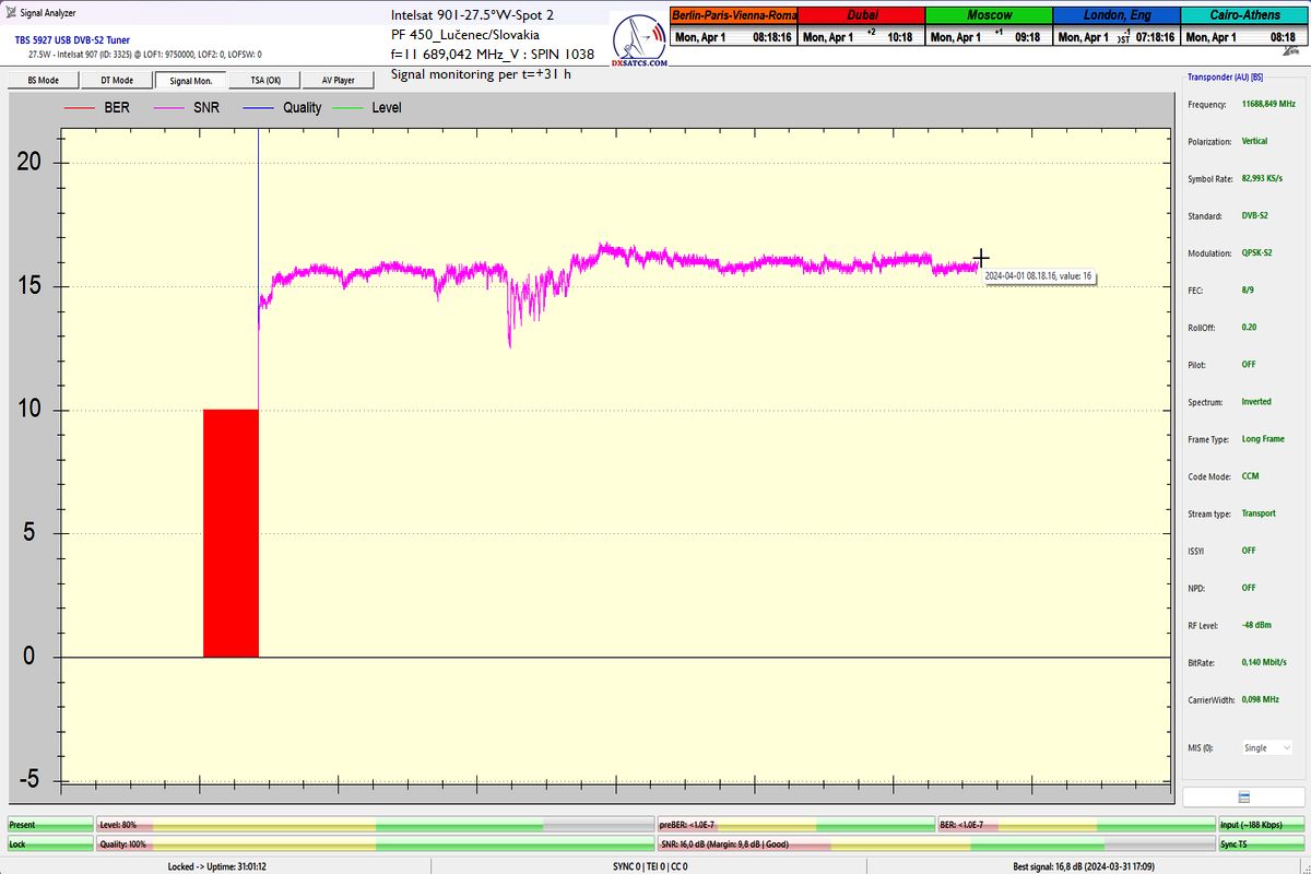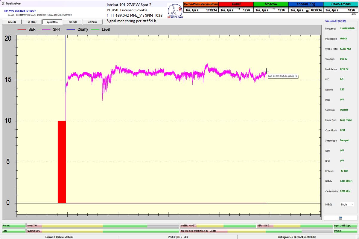 že som dosiahol jeden konštantný priebeh LOCK-u so špičkou kvality SNR=17 dB,bez jediného výpadku v kontinuite kvality Q, inak povedané dôkazná