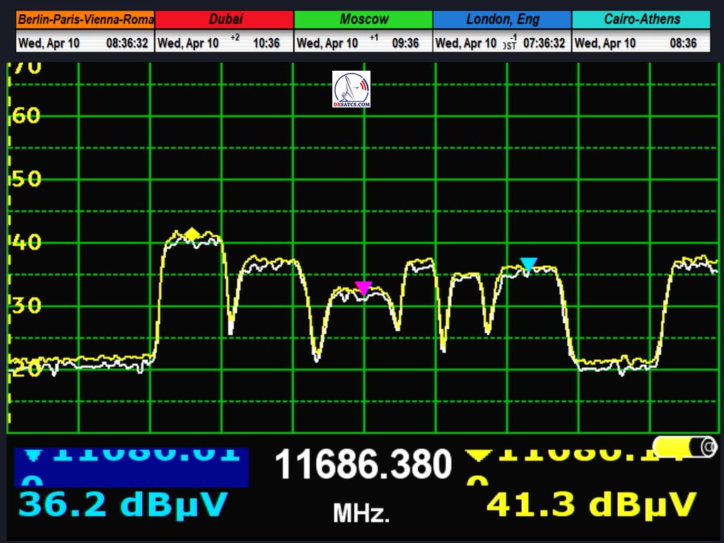 Spectrum analysis with a minimum SPAN of 100 kHz confirmed that in the range from 11 676 to 11 692 MHz_V, there are currently around 21 carriers with