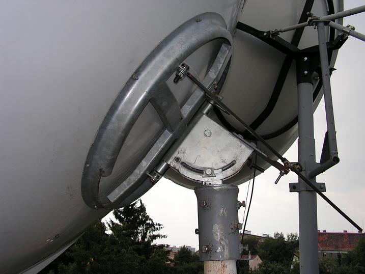 Samozrejme výrobca nepredpokladal že sa bude táto anténna sústava inštalovať na príjem družice NSS 6 na 95°E lebo konštrukcia uchytenia polárneho závesu dovoľovala na východe dosiahnúť orbitálnu pozíciu len 80° a ako o tom hovorí obrázok bol som nútený odrezať časť úchytu antény v dĺžke viac ako 20 cm lebo nízke elevačné uhly od 1,2° do 4,1° pri príjme družíc Yamal 201 na 90°E a NSS 6 na 95°E sa jednoducho nedali nastaviť.
