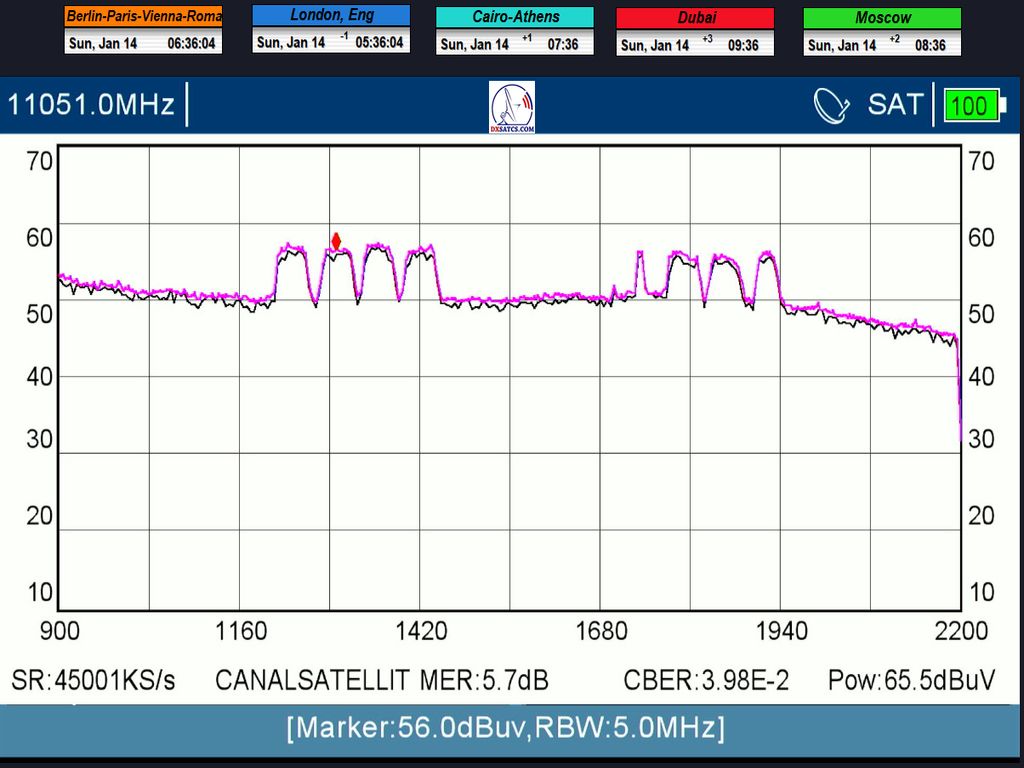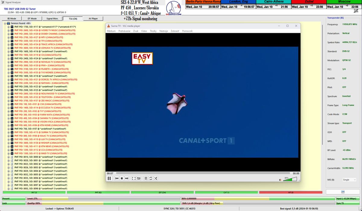 17.1.2024 :Canal+ Africa_Roman Dávid from Lučenec is the first in Europe to indisputably achieve a constant LOCK at two frequencies f=11 051+11 111 MHz.This accomplishment includes maintaining a state of consistently zero error rate BER=0.0000000 throughout the entire 72-hour monitoring verification unit, but exclusively on the frequency f=11 111 MHz. The research conducted by the author takes place in the geographical region of Central Europe with a reflector diameter (D) of 450 cm.