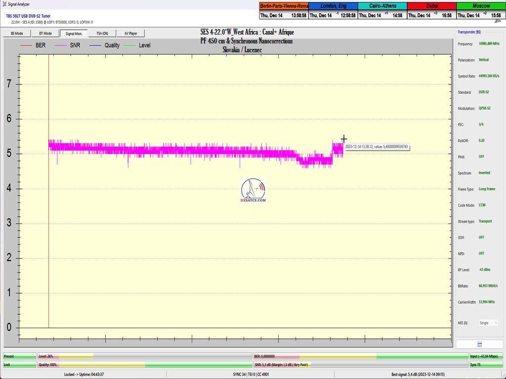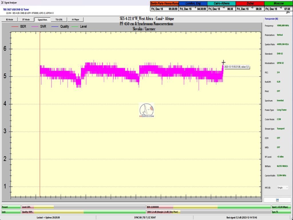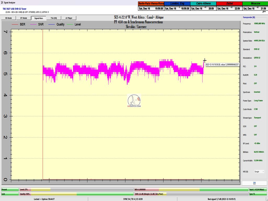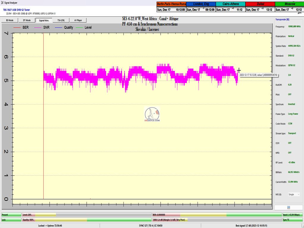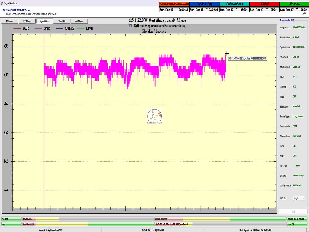 DE_Canal+ Afrika_Roman Dávid aus Lučenec ist der Erste in Europa, der unbestreitbar einen konstanten LOCK bei zwei Frequenzen f=11,051+11,111 MHz,erreicht hat.Diese Leistung umfasst das Aufrechterhalten eines konstanten Nullfehlerratenzustands BER=0,0000000 während der gesamten 72 stündigen Überwachungsverifizierungseinheit, jedoch ausschließlich auf der Frequenz f=11,111 MHz. Die vom Autor durchgeführte Forschung findet in der geografischen Region Mitteleuropa mit einem Reflektordurchmesser (D) von 450 cm statt.