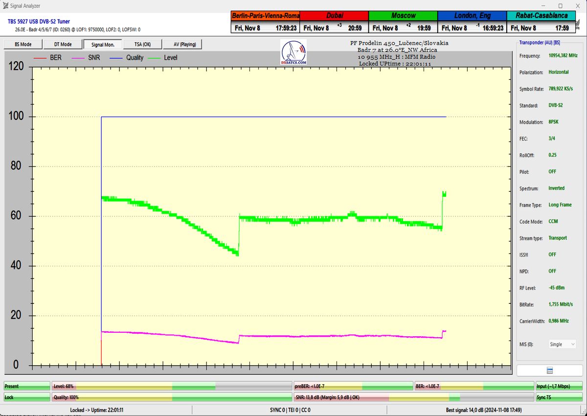 ►►Badr 7 at 26.0°E-Northwest Africa : Continuous signal monitoring / Nepretržitý signálny monitoring