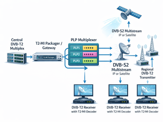 Popis blokovej schémy : Schéma znázorňuje centralizovanú distribúciu DVB-T2 multiplexov prostredníctvom štandardu T2-MI/PLP. Centrálny DVB-T2 multiplex je spracovaný blokom T2-MI Packager / Gateway, ktorý prevádza transportný tok na viacero Physical Layer Pipes (PLP), pričom každý PLP je nezávisle konfigurovateľný z hľadiska modulácie, kódovacej rýchlosti a ochrany proti chybám. PLP-y sú kombinované v PLP Multiplexeri a prenášané cez DVB-S2 Multistream alebo IP siete do regionálnych DVB-T2 vysielačov, pričom je zabezpečená presná synchronizácia a robustný prenos. Nakoniec DVB-T2 prijímače s podporou T2-MI dekódovania obnovia jednotlivé PLP a rekonštruujú transportný tok, čím umožňujú príjem SD, HD, UHD a mobilných služieb pri zachovaní vysokej integrity signálu.
