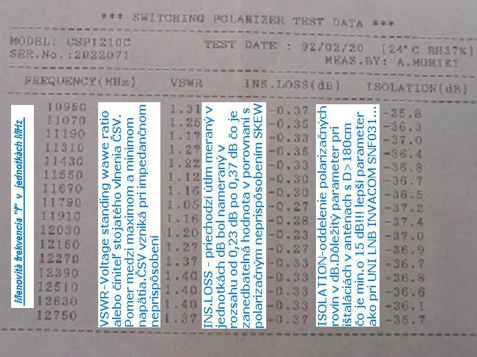 TÉMA : V nasledovnej téme konkrétne popisujem a zároveň odpovedám p.Dario Varad z Chorvátska o v profesionálnej oblasti vysoko cenenému a doteraz neprekonanému mechanickému spôsobu výberu polarizačných rovín vertikálnej a horizontálnej polarizácie pomocou MECHANICKÉHO ROTORA HIRSCHMANN CSP 1210 C,ktorý v porovnaní s polarizačnou výhybkou ORTHOMODE OMT zabezpečuje ešte o min.5 dB vyššie oddelenie - izoláciu polarizačných rovín CROSS POLAR & CROSS ISOLATION pri takmer zanedbatelnom prechodovom útlme,ktorý v porovnaní s úbytkom signálnej kvality spôsobenej polarizačným neprispôsobením môžeme považovať za nulovú.Ako o tom vypovedá výnimočný ATEST nameraných parametrov priamo od výrobcu z Japonska parameter oddelenia polarizačných rovín ISOLATION /dB/ je o takmer 13 dB !!! lepší ako napr. pri konvertore INVACOM SNF 031 alebo SNH 031 čo je nesmierne dôležitý parameter hlavne pri inštaláciách RX antén s priemerom nad 180 cm ako o tom píšem v práci :