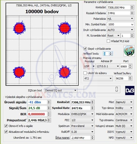 demonštruje aj vizualizácia ideálnej kvality v podobe štyroch stavov konštalácie QPSK,čo len potvrdzuje fakt že mimoriadne